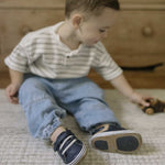 The Adam First Kicks in Blue Leather give budding walkers an incredibly cool sneaker style to wear, just like the adults. The blue leather sneaker resembles a pair of high-tops parents sport from day to day and is outfitted with a geometric tan suede detail, hook and loop strap, and faux laces. The split rubber sole below grips the floor and helps prevent unnecessary slips and spills.