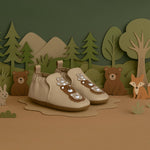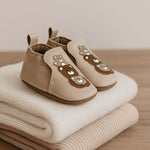 Snuggle up with the Bear Hugs Soft Soles in Tan, decorated with three cuddly bears sharing a hug. The soft tan tone pairs perfectly with the sweet design, while the suede outsole offers gentle grip and comfort for your little one's first steps.