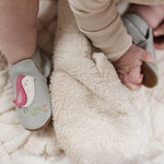 Your little one just hatched, now let them take their first steps with some happy chirps! These grey leather shoes featuring a pair of bird buddies are the cutest baby shoes you can find, and perfect as baby's first shoes for walking. The ankles are elasticized for easy slip-on action, and they help keep your baby's feet securely perched inside. The front half of the shoe is lined to help feet stay dry and cool throughout the day. With a suede, feather-soft interior, this whimsy pair makes the best soft-soled baby shoes for walking.