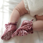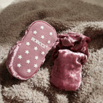 Introducing the Bonnie Velvet Snap Booties in Pink crushed velvet are this year's go-to cozy baby bootie style. Adding flair to your baby booties, they're made of pink crushed velvet with a matching knot bow, which makes them perfect for dressing up. A two-snap closure makes sure they stay on your baby's feet, while the grippy bottom on the soft sole helps prevent spills for adventure seekers learning to walk.