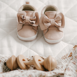 Get your little one stepping in style with these light pink toddler shoes. Made with high-quality genuine leather and soft, suede soles, these baby girl dress shoes offer the ultimate comfort and style. Each pair features a stylish structured design with a big pink leather bow at the top. A white leather strip runs along the heel that adds a little touch of chic. The Aria First Kicks in Pink has been designed with a cushioned insole and ultra-soft suede outsole to provide protection and comfort for healthy foot development. They come with elastic straps that make them easy to slip on and they stay on. Add a touch of cuteness to your toddler's look with these adorable baby girl dress shoes!