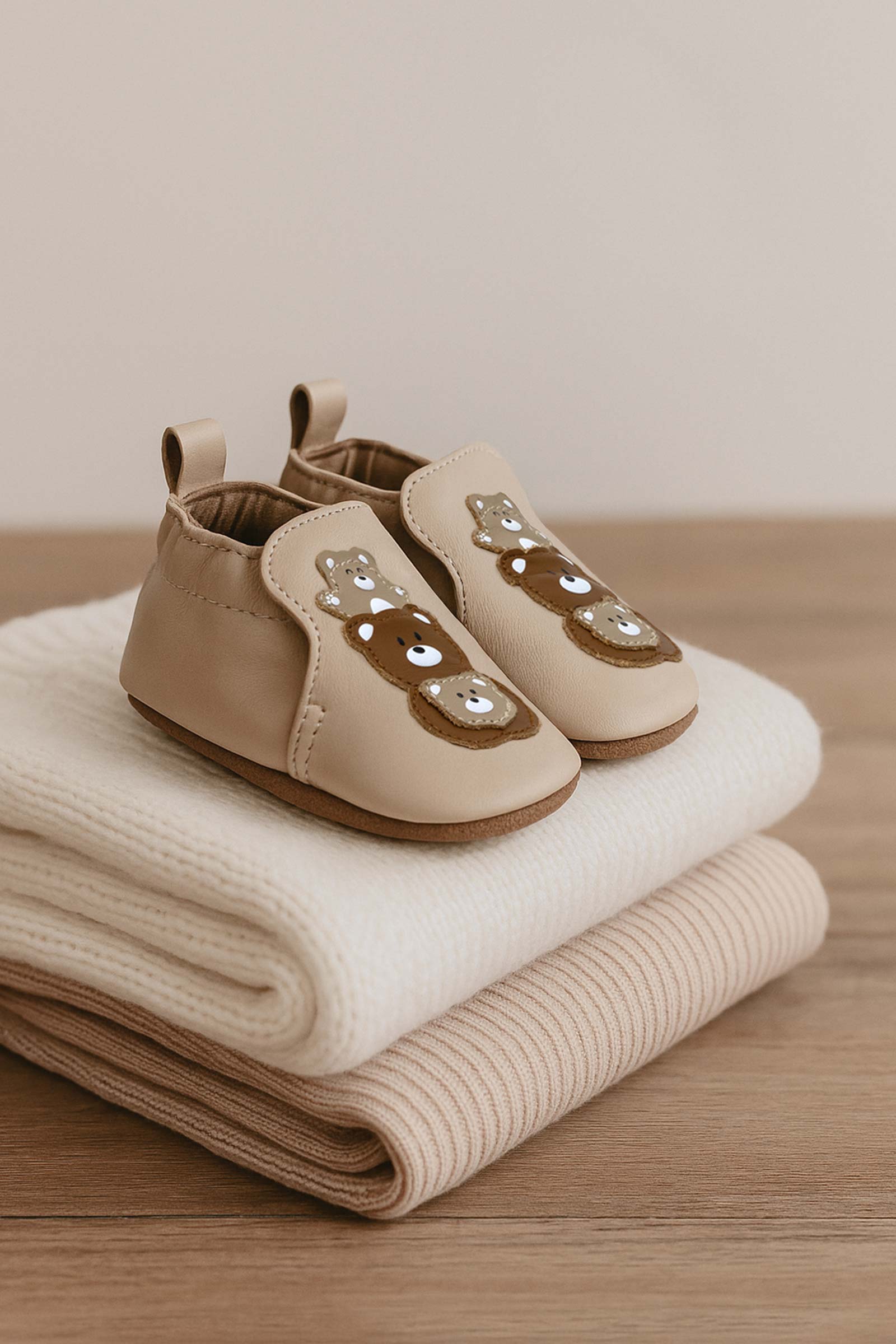 Snuggle up with the Bear Hugs Soft Soles in Tan, decorated with three cuddly bears sharing a hug. The soft tan tone pairs perfectly with the sweet design, while the suede outsole offers gentle grip and comfort for your little one's first steps.