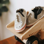Everybody run! Here come the Dino Dan Soft Soles—crafted with premium twill and pebbled leather materials and made to mimic an adorable grey dinosaur with three-dimensional head and tail fins. These toddler dinosaur shoes are designed to keep your baby's feet warm and cozy and give their tiny toes ample room to wiggle around and grow. And when your little one is ready to take their first steps, these soft-sole dino shoes will be there to support their feet on the floor with a slip-resistant grip! Get your baby these cute dinosaur slip-on shoes today!