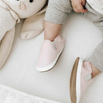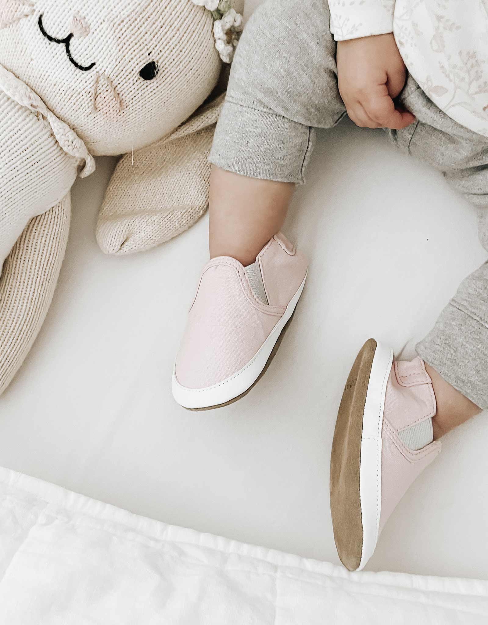 The Liam Basic Soft Soles in Pink are baby canvas slip-on shoes that need no introduction. It's a classic pink baby shoe that's made in a stretchy, breathable canvas material with elasticized metallic side panels and a cinched heel, and it's designed to stay on your baby's feet. Non-constricting and roomy, these pink shoes feature a soft suede sole to help grip the floor and keep beginner walkers on their toes.