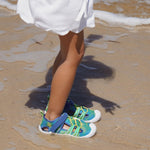 The Ice Dye Water Shoes in Blue are a perfect blend of style and comfort for your little one's adventures. With a soft, quick-drying upper and a slip-resistant outsole, they offer stability on wet surfaces, while the velcro strap ensures a cozy, secure fit. These shoes capture the essence of playful charm, perfect for beach days and water-filled memories.