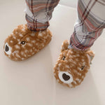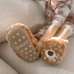 The Robeez Willow Light-Up Slipper in Camel plush faux fur deer motif with 3D ears-flower, embroidered details and lights. Featuring a suede bottom with non-skid print & stretch back feature for stay on, play on power. *Battery included (to light up deer's eyes).