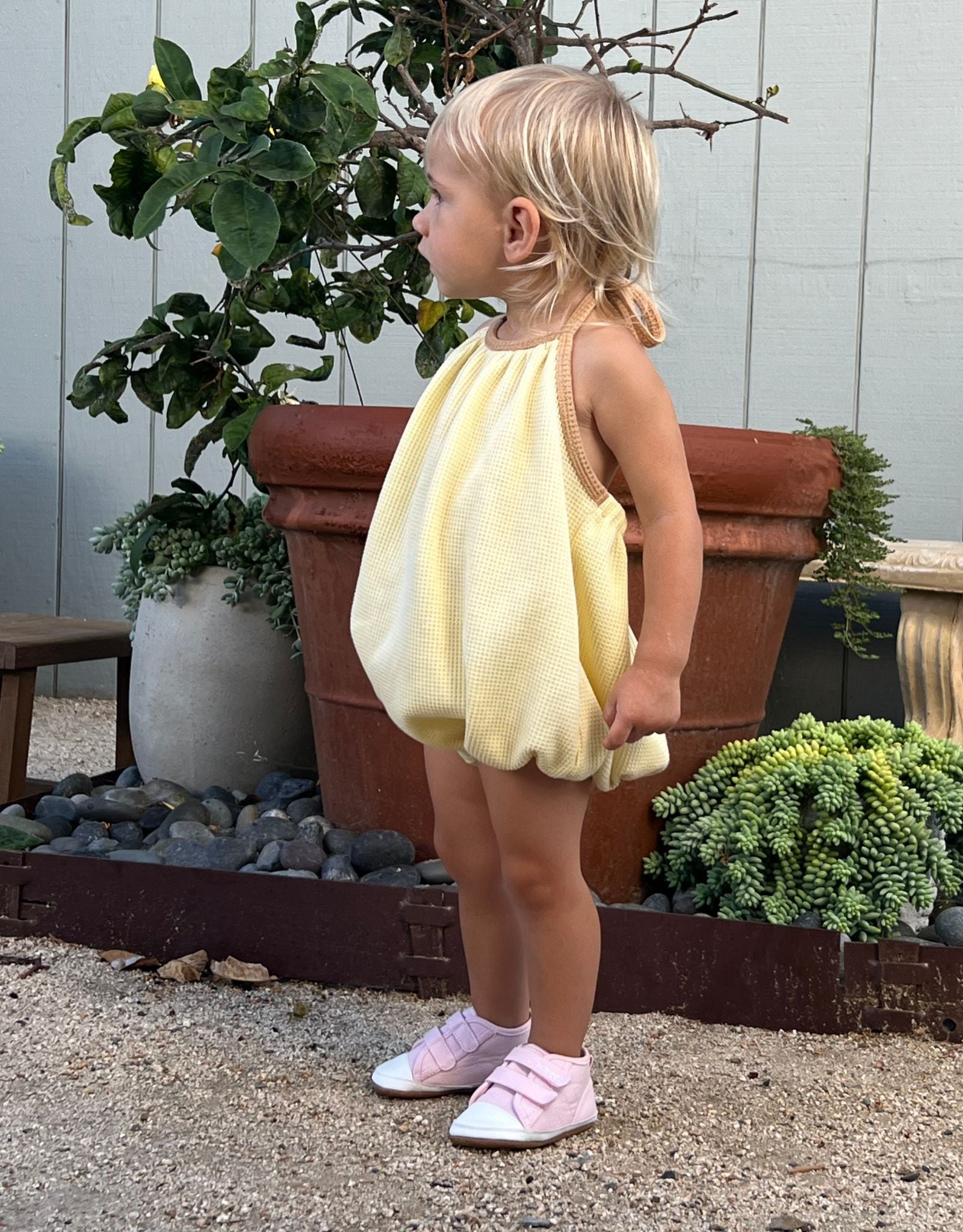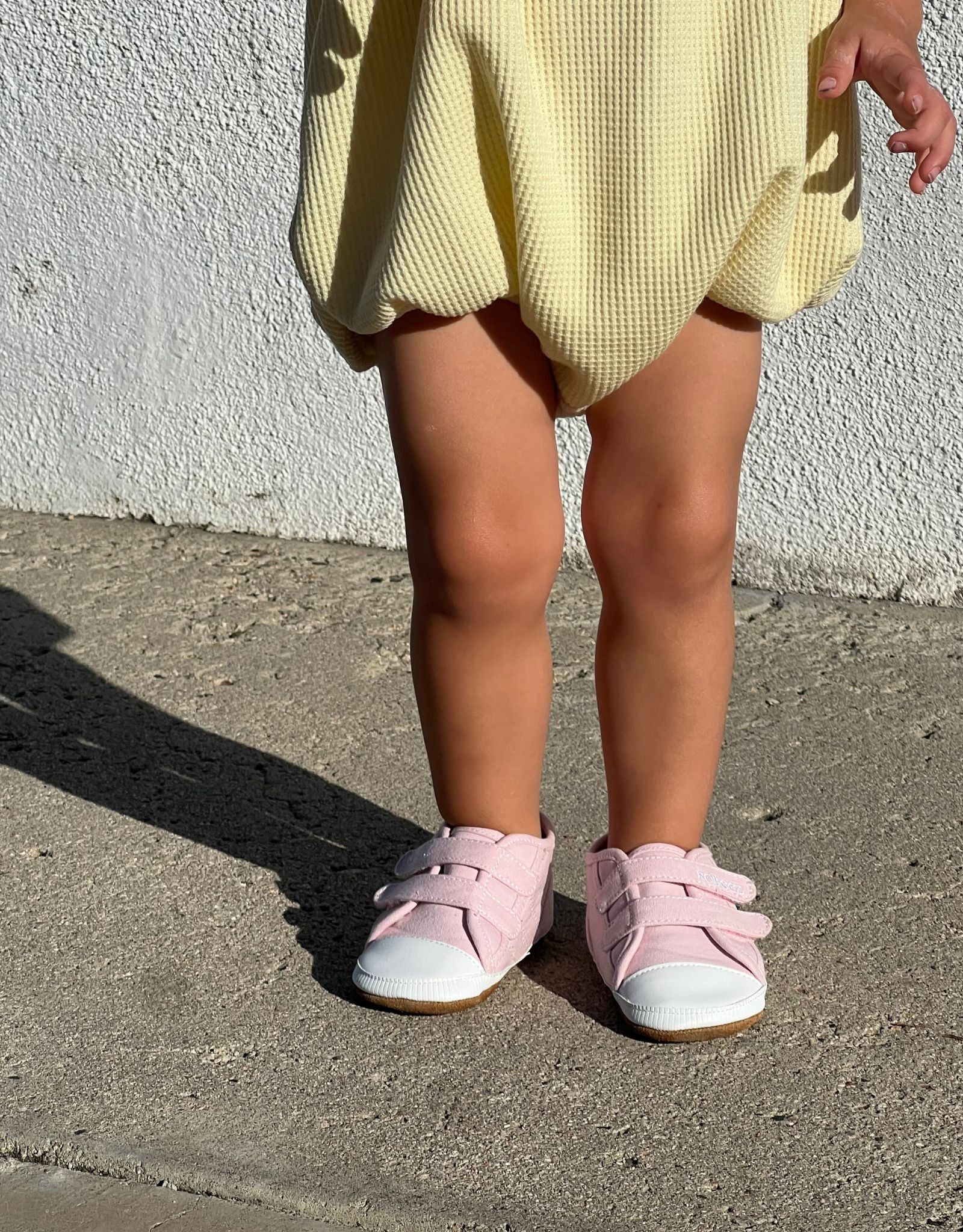 The Robeez Joleen Sneaker in Light Pink adds a casual yet stylish flair to your little one's wardrobe. This awesome navy canvas sneaker is accented with matching binding, contrast topstitch, logo embroidery and double loop strap closure detail. The First Kicks silhouette is made with more support and a narrower build than our Soft Soles style.