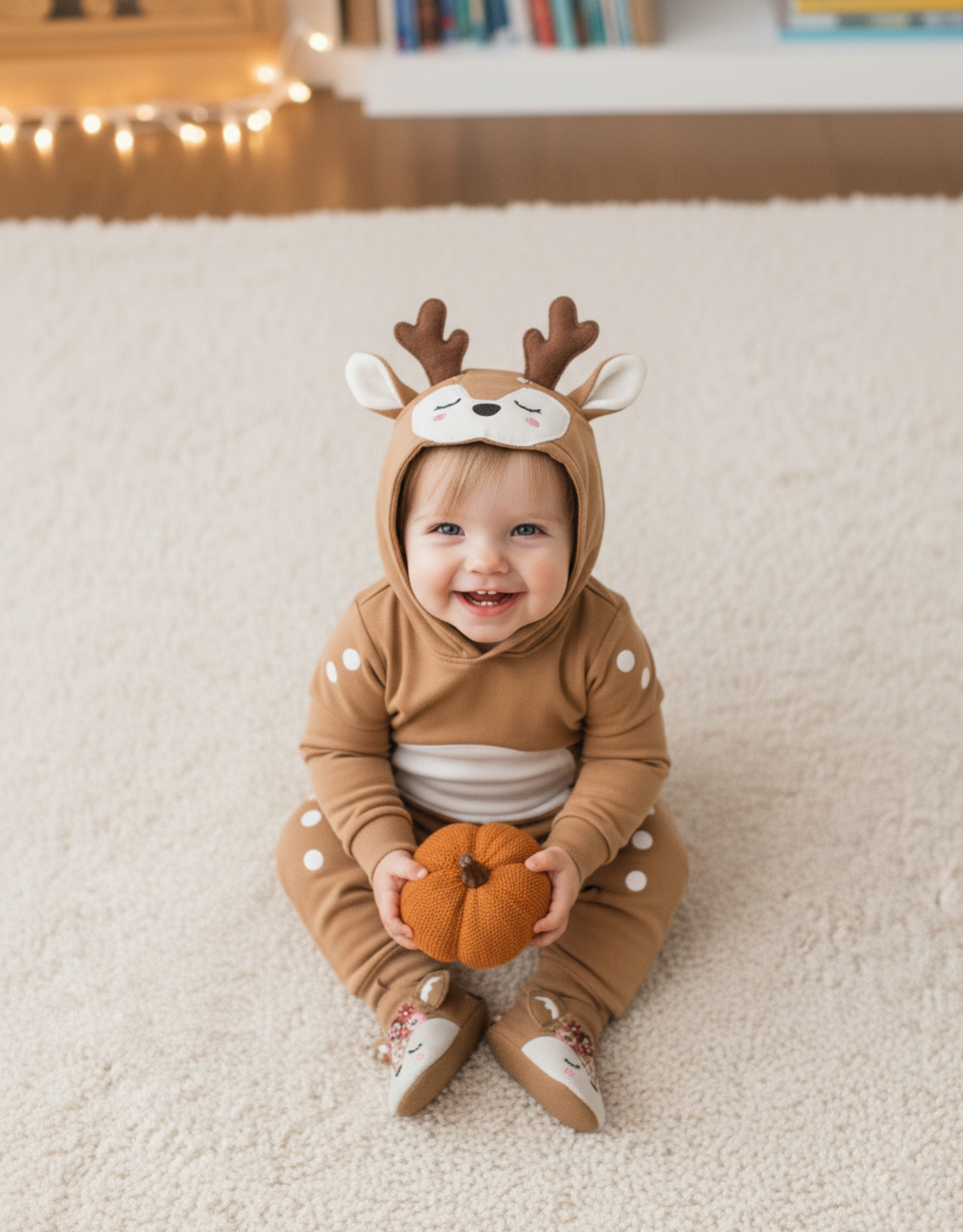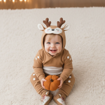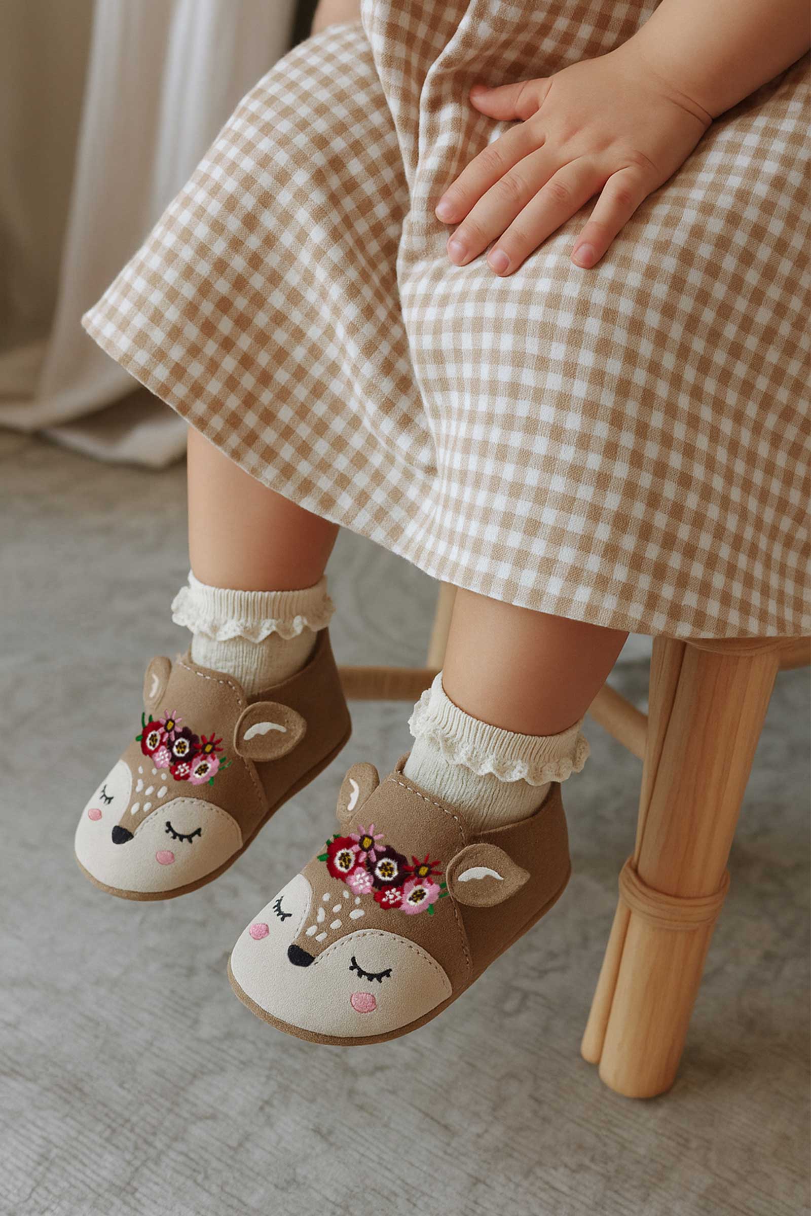 She is so cute and will look even cuter in the new Josephine soft soles shoe in camel suede. Featuring a floral baby deer design with 3D ears and a cute face applique. This style has a suede bottom & room to grow, they're flexible with movement & non-constricting for better balance and stay on, play on power.