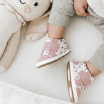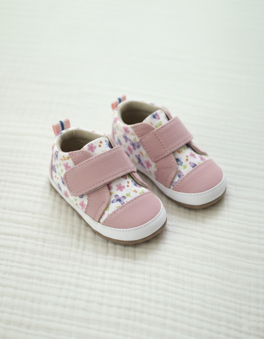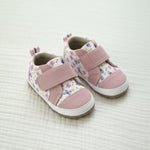 Rina First Kicks in Pink combine playful style with thoughtful design for early walkers. Featuring a soft floral pattern with blush pink accents, these baby shoes add a sweet, modern touch to any outfit while staying practical for everyday wear. Designed to be kick-proof and easy to slip on, they stay securely in place for active little ones. A roomy fit supports growing feet, while the lightweight sole and textured bottom help provide comfort and confidence as your child takes their first steps.
