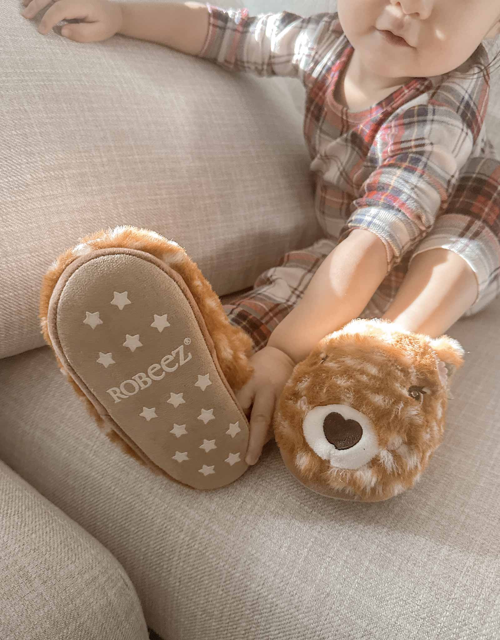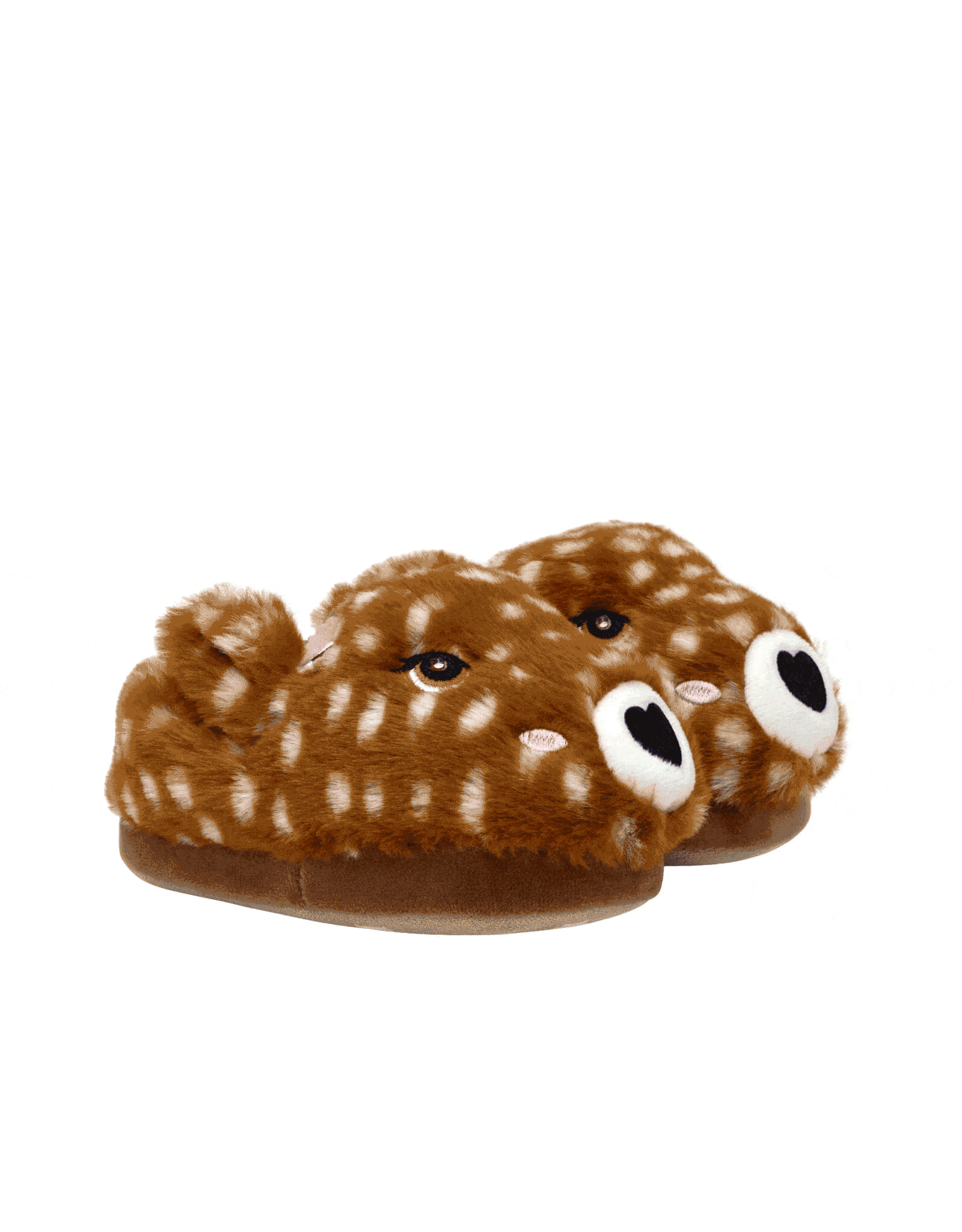 The Robeez Willow Light-Up Slipper in Camel plush faux fur deer motif with 3D ears-flower, embroidered details and lights. Featuring a suede bottom with non-skid print & stretch back feature for stay on, play on power. *Battery included (to light up deer's eyes).
