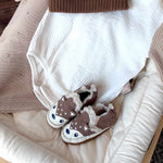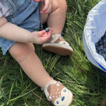 What a cute fox! With this super Brave Fox soft soles in Camel Wool, plush sherpa edges, applique face and 3D details it is a must for you to get. With a suede outsole and an elastic strap and cinched heel are added so that they stay on during any baby activity: sitting, crawling, wobbling, or walking.