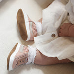 Robeez Gina Soft Soles in Blush are comfortable baby slip-ons made with a premium leather upper and a neutral brown suede on the sole. Shiny metallic leather pattern detail accross the back matching metallic stretch laces are sure to make your cutie stand out. A roomy fit and flexible material allow your baby's feet to flex naturally and grow up strong. These soft bottom baby girl shoes are carefully designed with the best materials and craftsmanship for your baby's health, comfort, and safety.