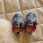 The Jarette First Kicks in Navy blend classic style with everyday comfort. Made with a mix of navy and brown leather, this sleek design features a single strap closure for easy on-and-off, plus a bold red lining for a fun pop of color. The flexible sole and roomy fit support natural movement, making these kicks perfect for growing feet on the go.
