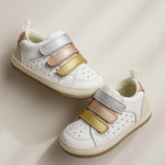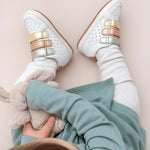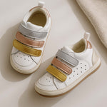 The Novie First Kicks in White bring playful shine to a classic silhouette. This double-strap sneaker features a crisp white upper paired with metallic straps in silver, rose gold, and gold, adding just the right amount of sparkle. Whether it's for first steps or first photos, they're a charming and practical pick for any baby's wardrobe.