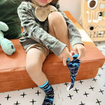 Beware of the new T-Rex in town! Presenting Robeez Roaring Dino CRW socks in Navy with back 3D spike details, fun multi stripe pattern and all over fun T-Rex dino reapeat print. All pairs have seamless toe construction & knitted logo on the bottom of sock.