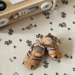 Tiny feet, big style. Introducing the Stuart First Kicks in Tan - the canvas sandals designed to keep up with your active, adventurous child. Designed as fisherman sandal silhouette with supportive rubber and suede sole.Crafted from premium tan canvas, these sandals offer breathability and a timeless aesthetic that complements any little ones outfit. The adjustable Velcro straps allow you to get the perfect fit as your little one's feet grow, while the supportive sole provides the stability they need to tackle every playground, park, and family outing with confidence.