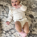 Parents love our socks because they stay on in all kinds of play. An elastic gather at the ankle ensures that our socks stay on while a skid resistant application on the soles helps prevent slips and falls. Once you try our socks, you and your baby will love them as well