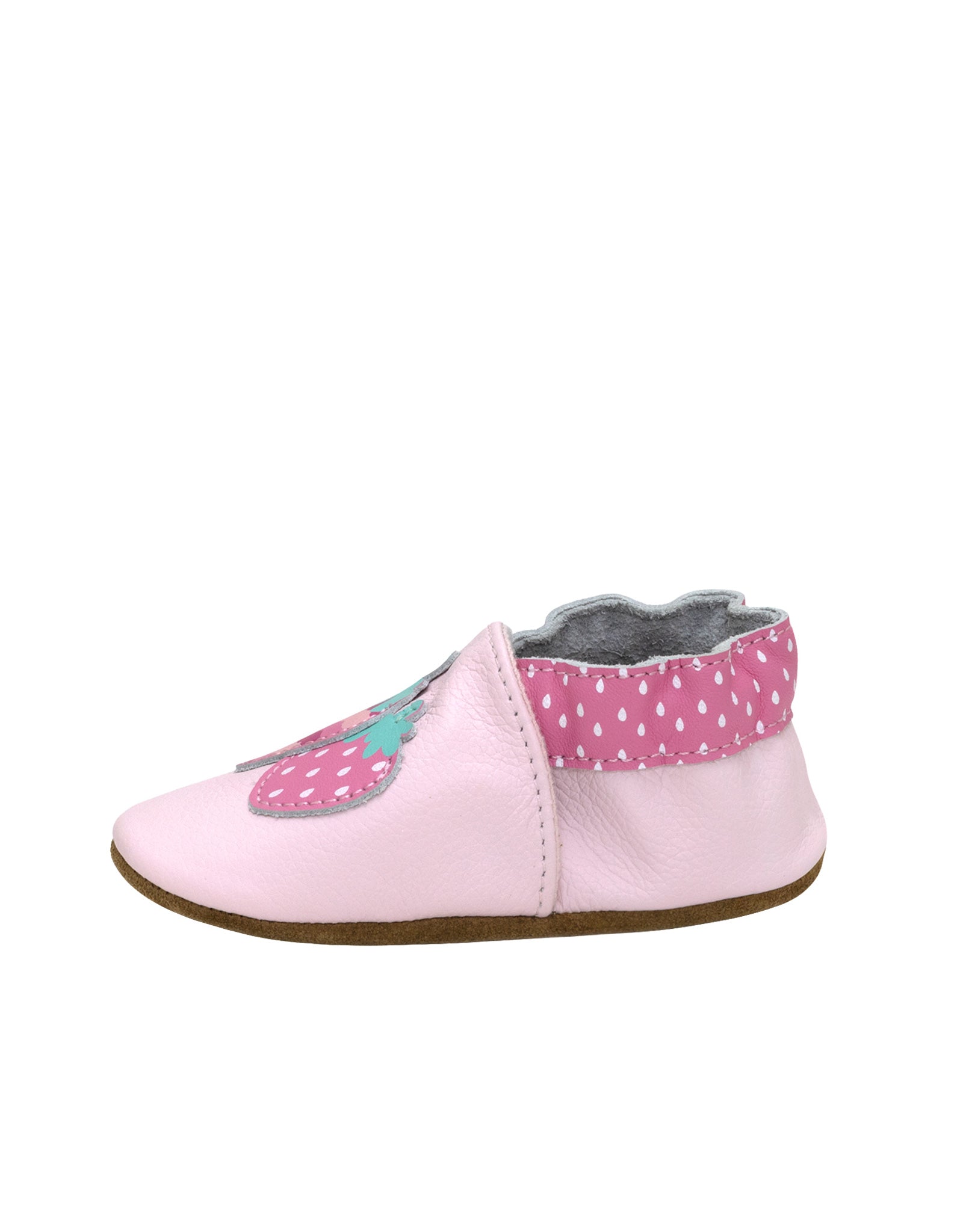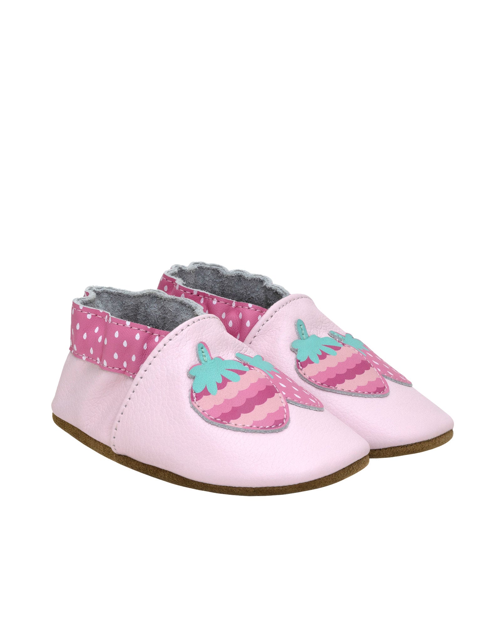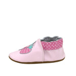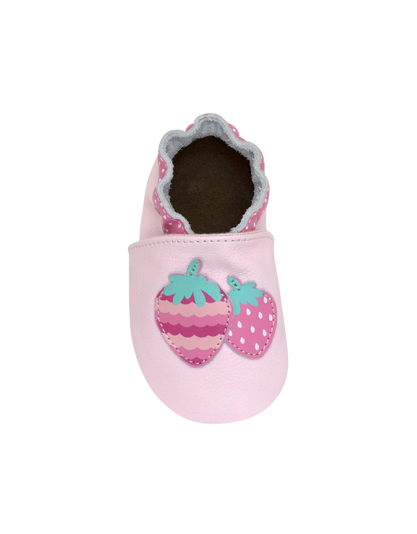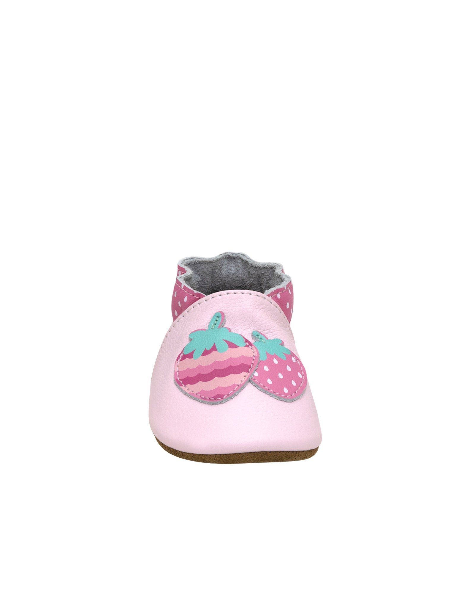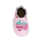 Berry Sweet Soft Soles in Light Pink are soft leather baby shoes featuring strawberry appliqués and a flexible, barefoot-inspired design. The slip-on style supports natural foot development and includes a slip-resistant suede sole to help provide gentle traction.