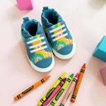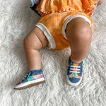 Inspired by the Crayola Tie Dye products, this new Rainbow Tie Dye soft soles by Robeez is just too groovy! With a printed canvas, denim accents, faux stretch laces and embroidered art on bottom sole is the perfect burst of fun for your cutie's outfit. They're flexible with movement & non-constricting for better balance, so your little one can run, jump and play without any restrictions.