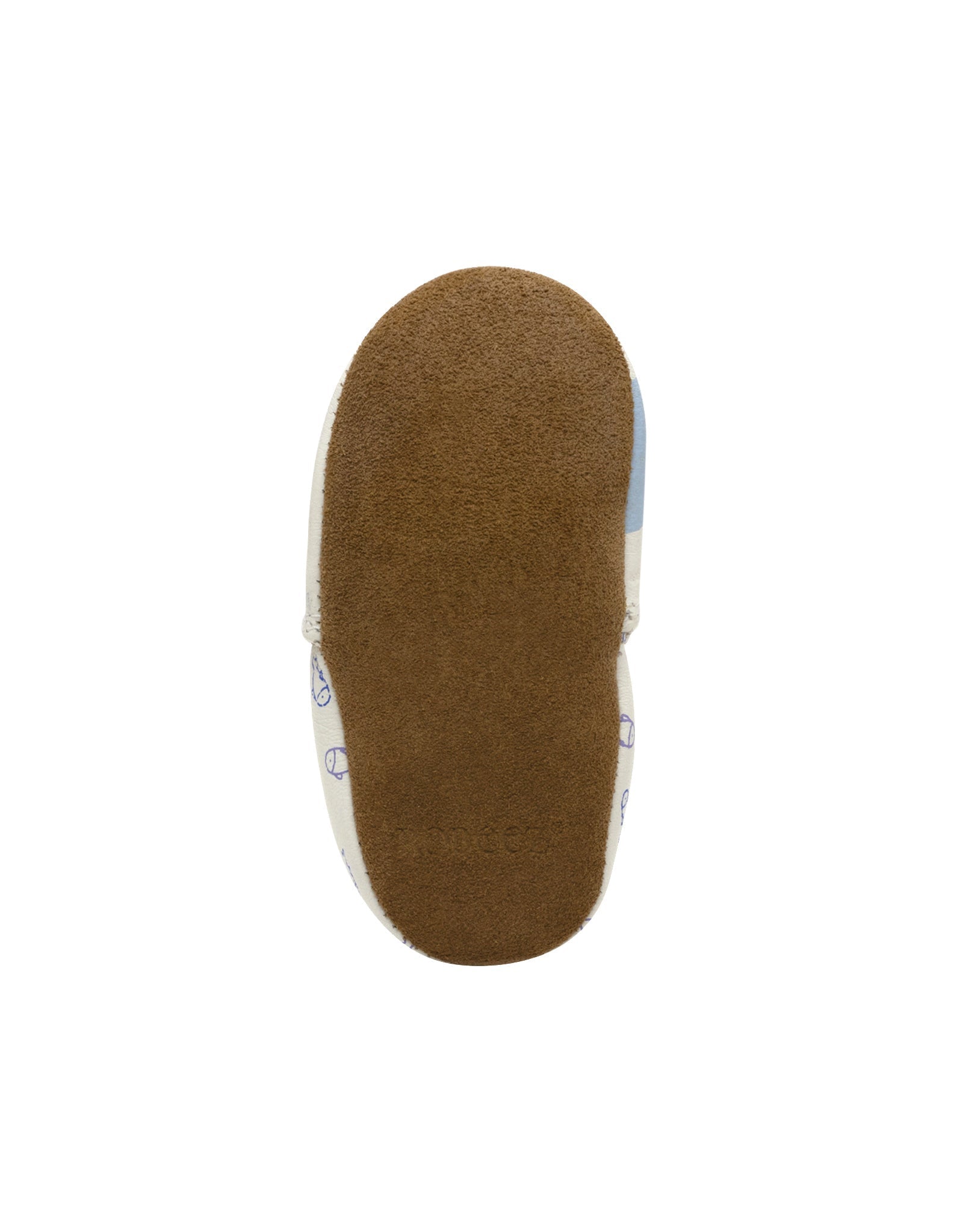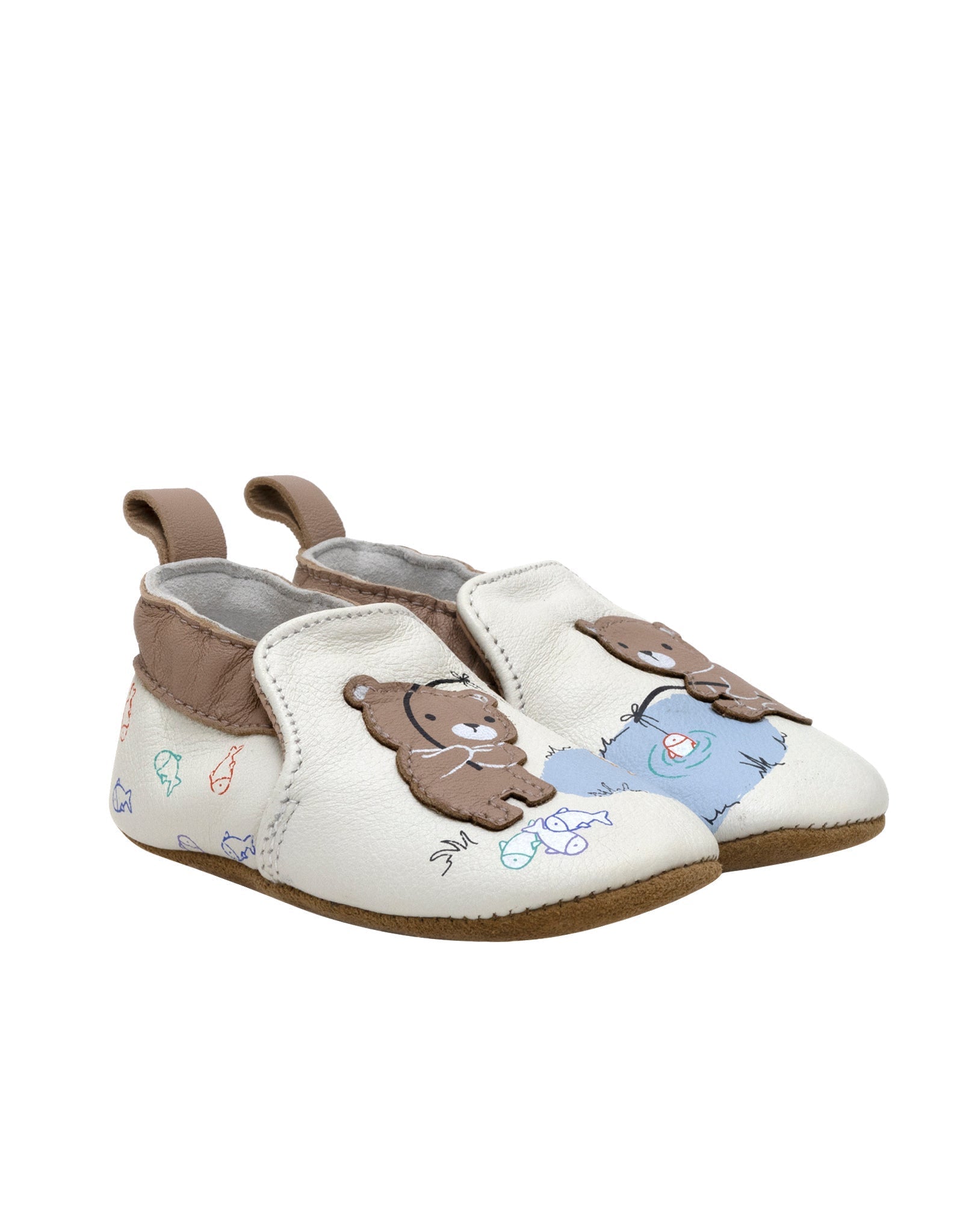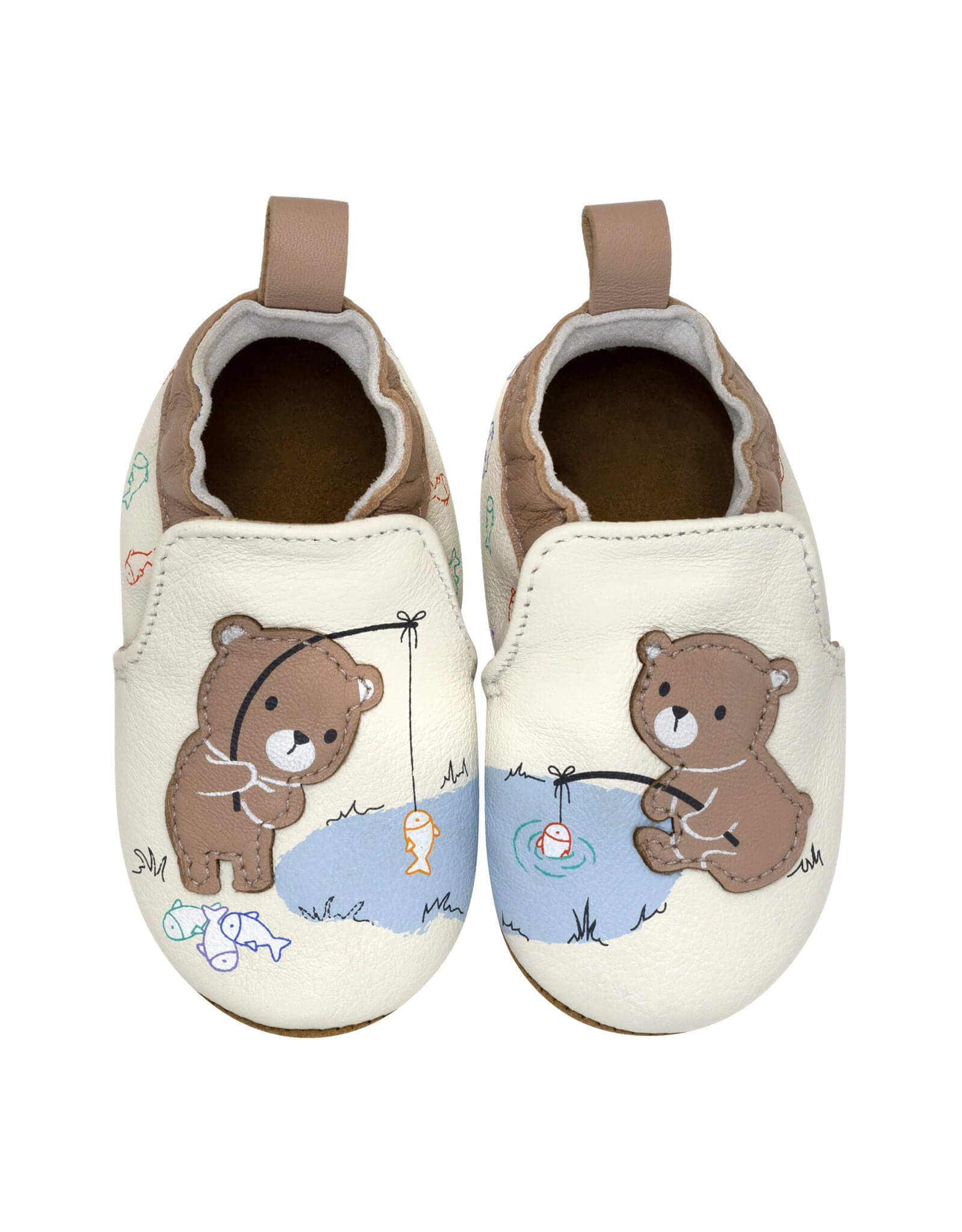 The Great Catch Soft Soles in Ivory are an adorable and playful choice for your little one's everyday adventures. Featuring an endearing design of a baby bear fishing for little fish, these shoes bring storybook charm to their tiny toes. Crafted with soft ivory leather and brown accents, they offer a kick-proof fit that stays securely on, while the flexible, non-constricting design mimics the natural feel of bare feet. Perfect for little explorers, the easy-on, play-on style ensures all-day comfort and convenience for both parents and kids. These soft soles are sure to make every step a big catch.