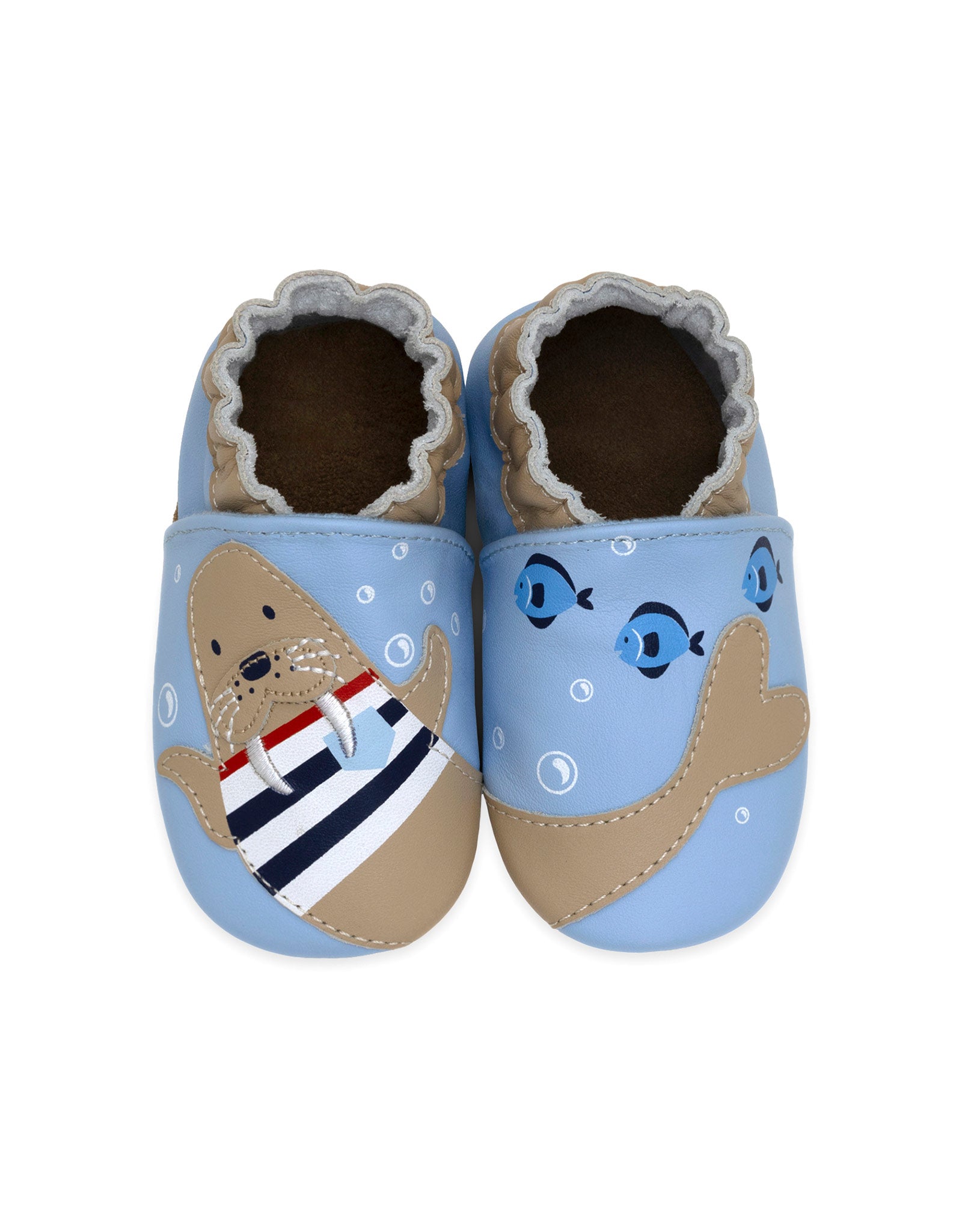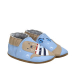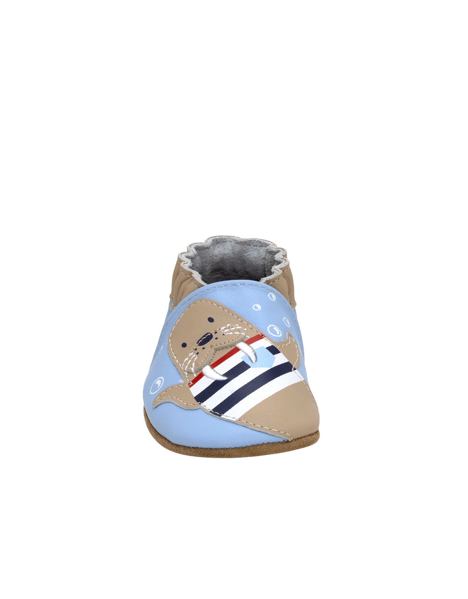 Designed for comfort and easy wear, Walrus Squad Soft Soles in Light Blue features a charming walrus appliqué on smooth light blue leather. The slip-on silhouette allows for quick changes, while the flexible fit supports natural foot movement. Finished with a textured suede sole, it offers gentle traction as babies begin to explore.