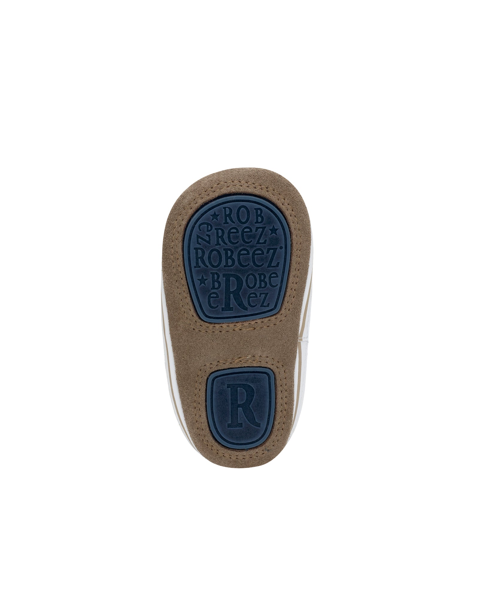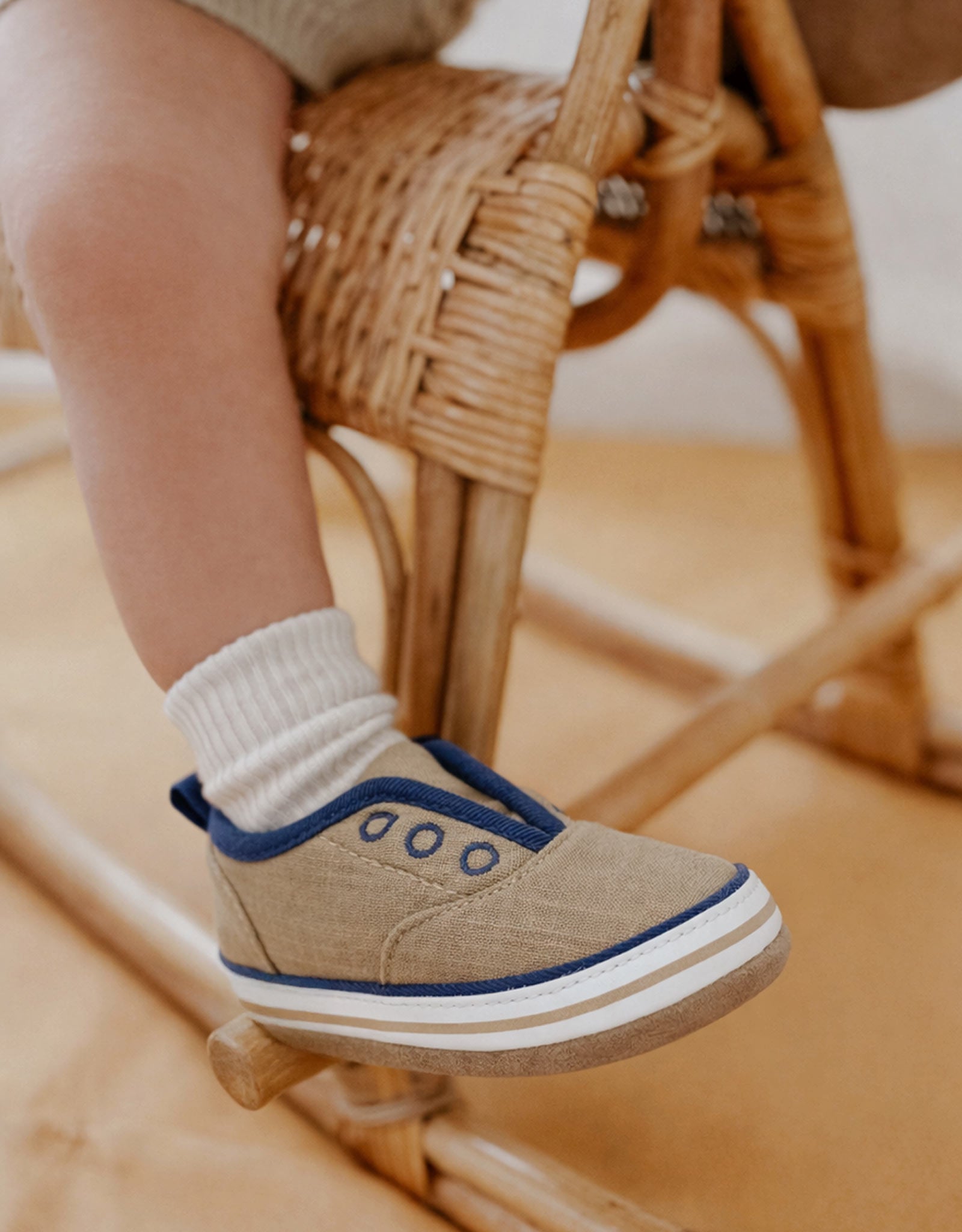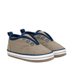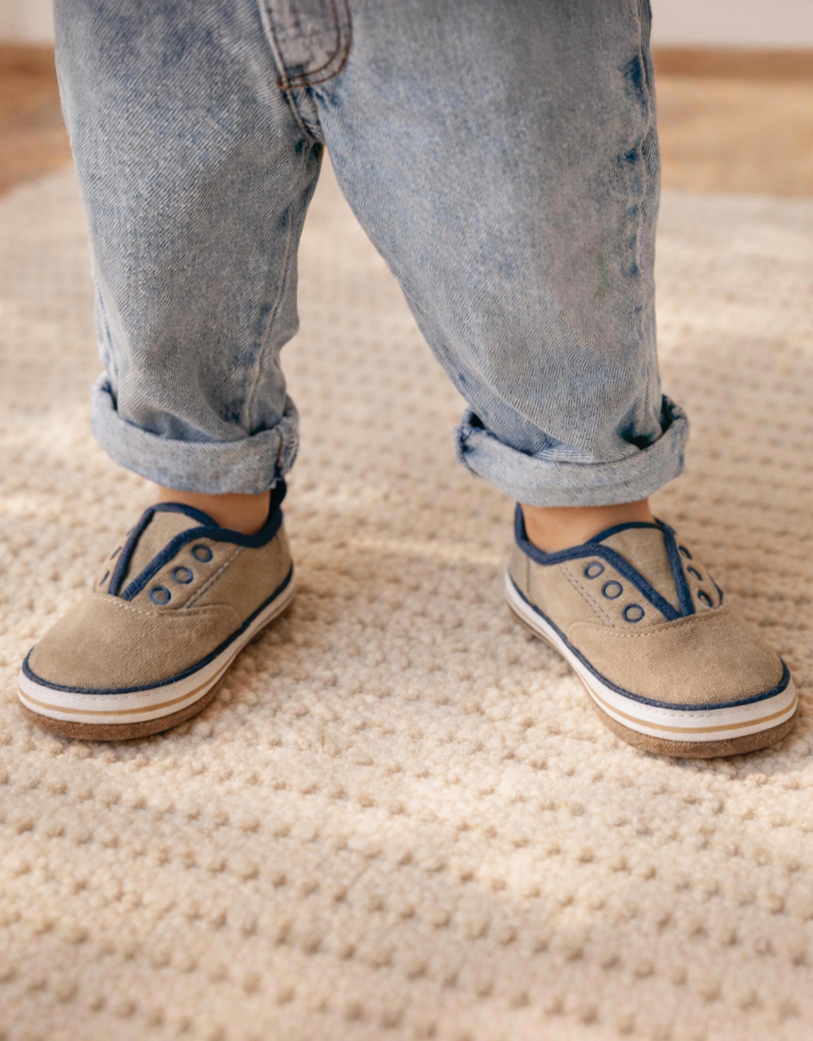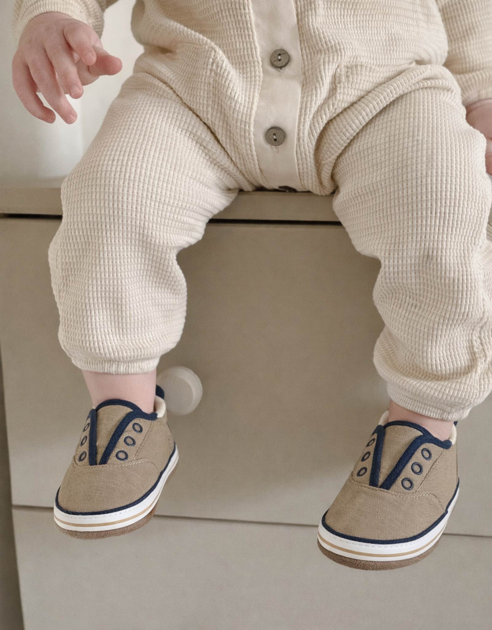 Designed with a clean, modern look, Calder First Kicks in Taupe blend soft neutral tones with navy accents for a timeless sneaker feel. These kick-proof, slip-on baby shoes offer a roomy fit for growing feet, while the lightweight sole and textured bottom provide gentle support for early walkers.