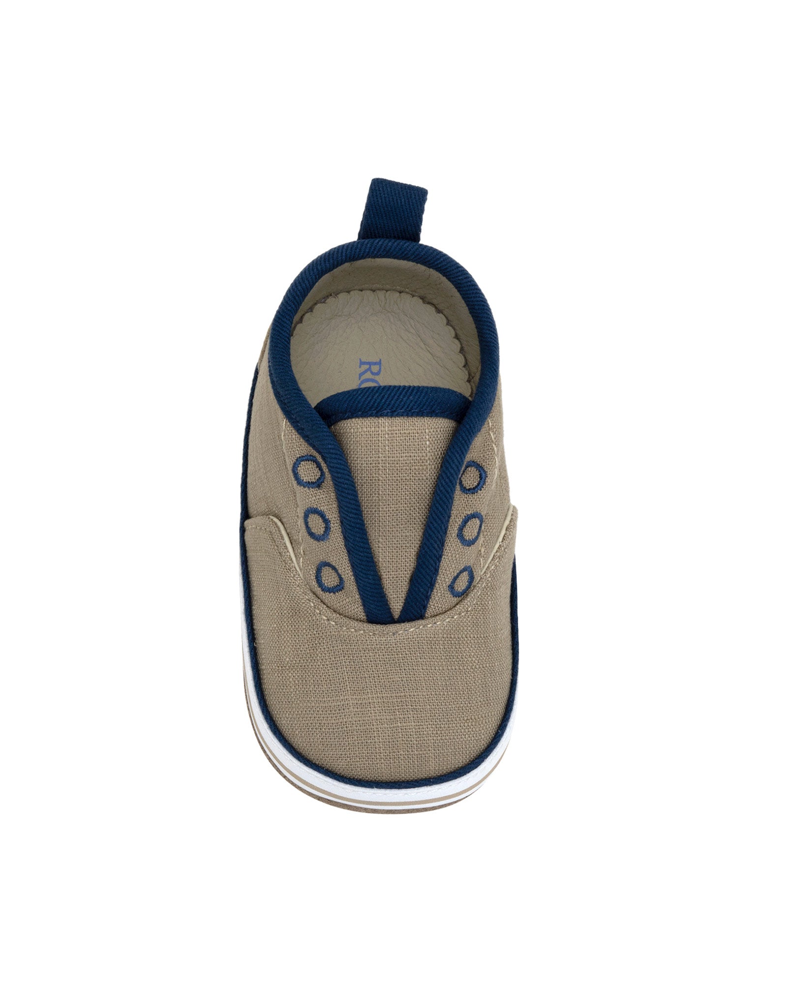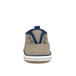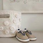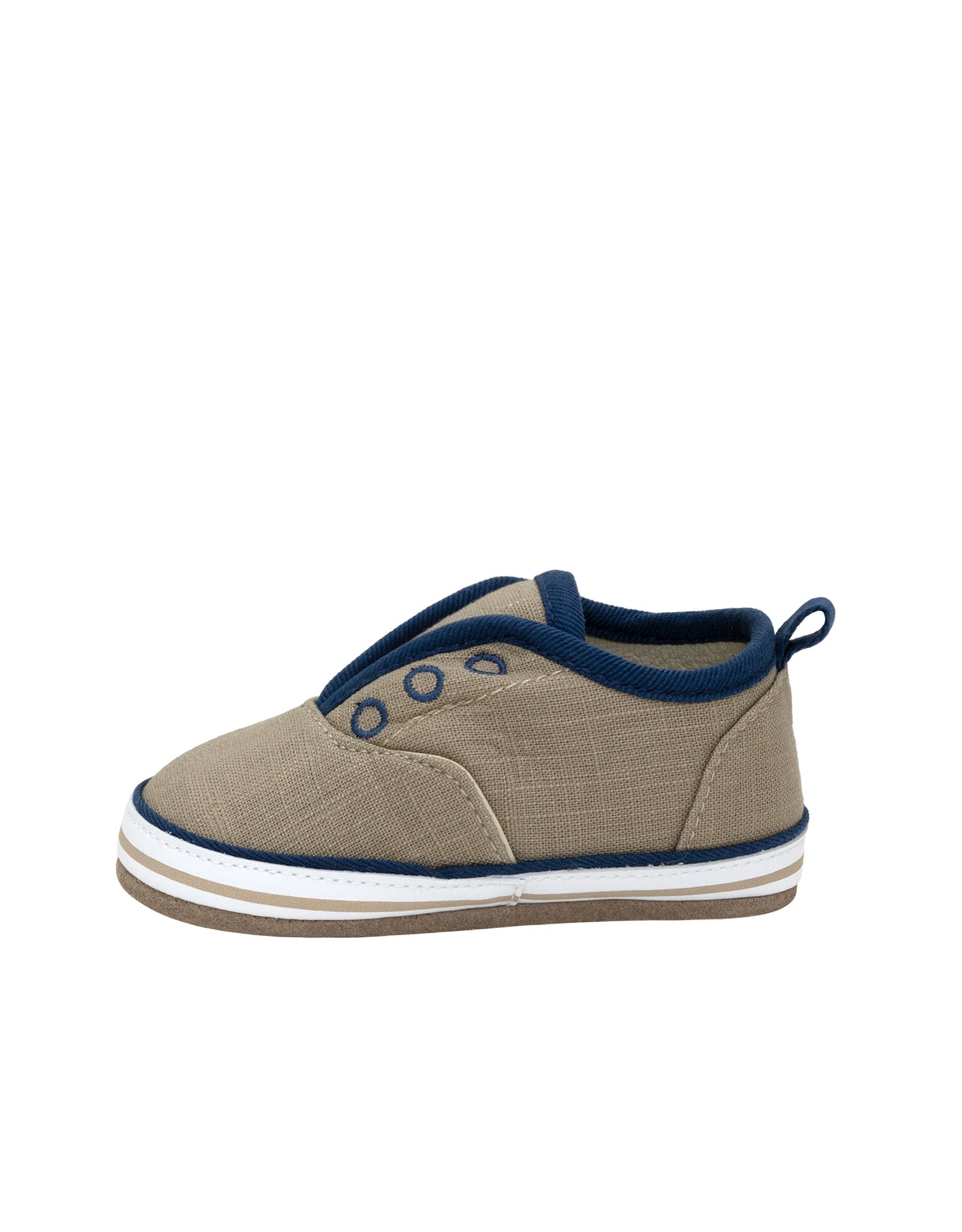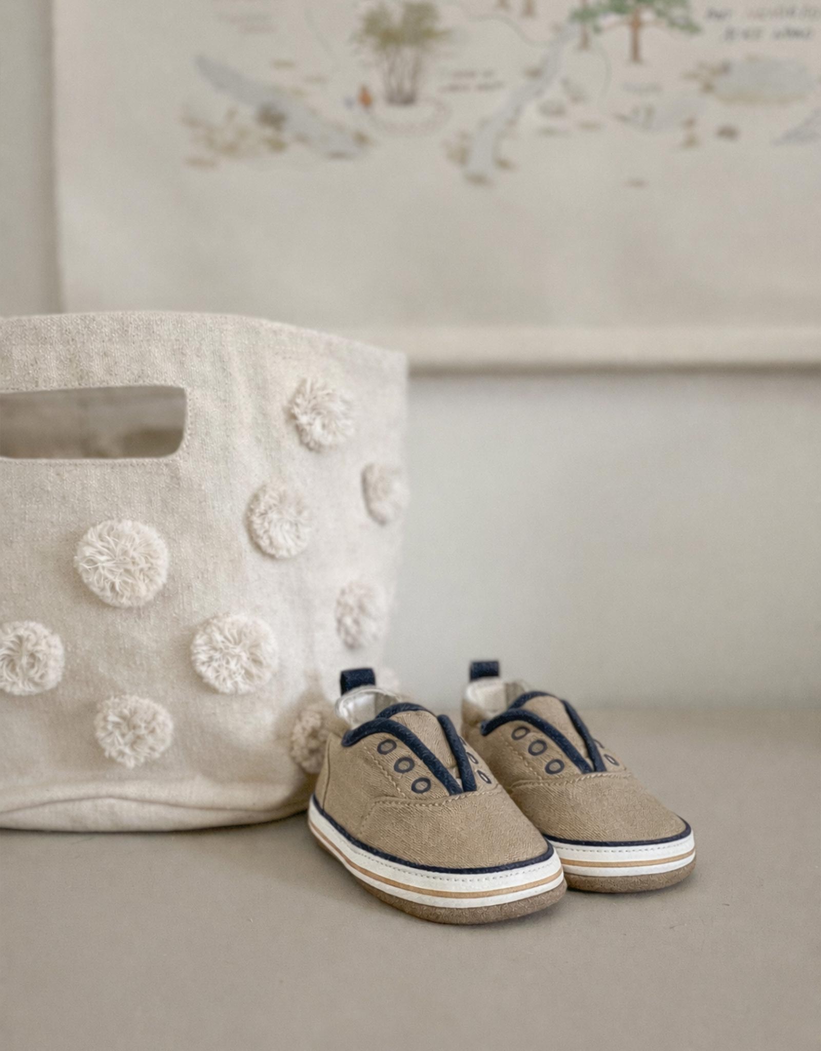 Designed with a clean, modern look, Calder First Kicks in Taupe blend soft neutral tones with navy accents for a timeless sneaker feel. These kick-proof, slip-on baby shoes offer a roomy fit for growing feet, while the lightweight sole and textured bottom provide gentle support for early walkers.