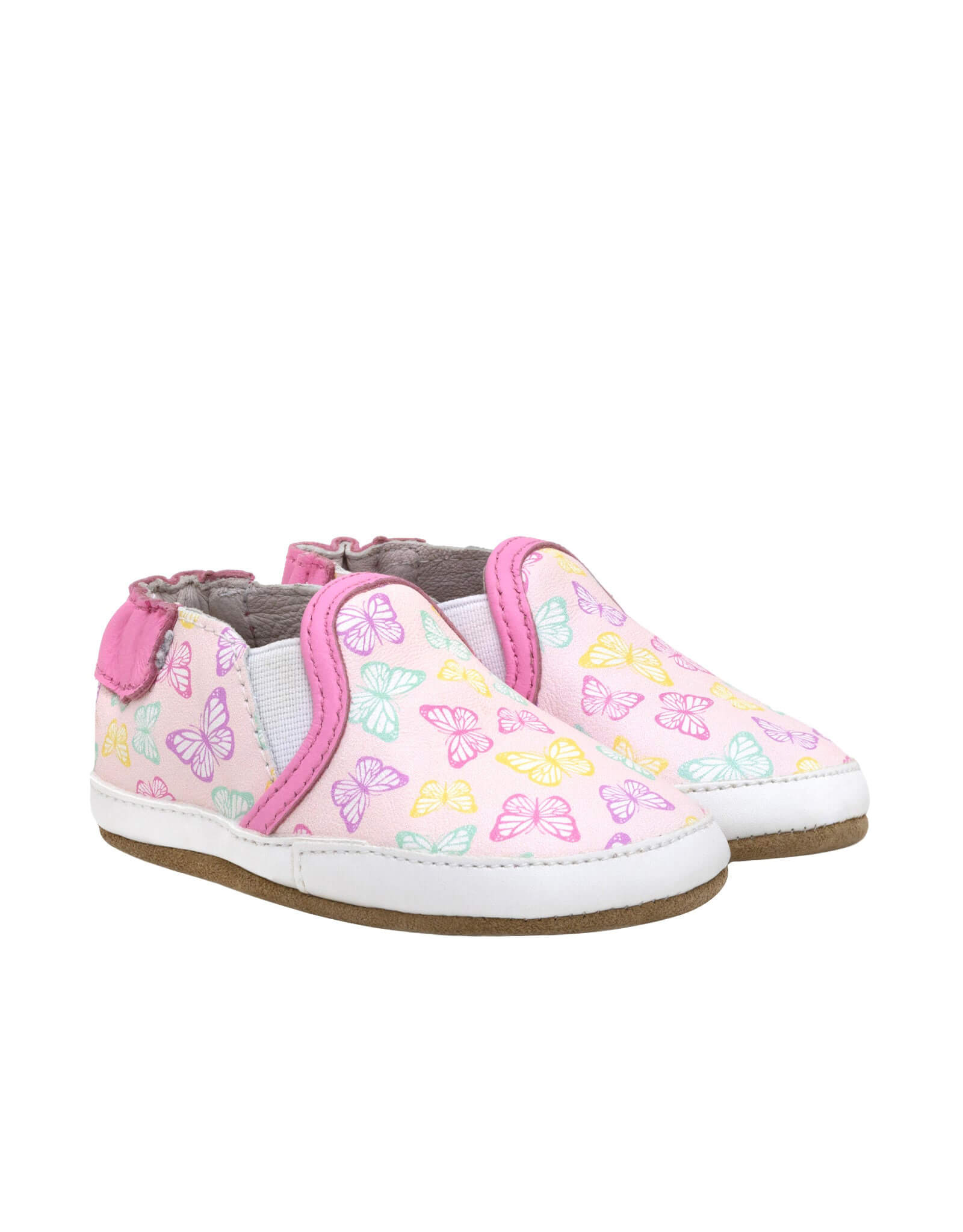 Elevate your little one's style with the Fly Away With Me Soft Soles! These adorable baby shoes are crafted from light pink leather and feature charming butterflies design that will have your toddler fluttering with delight. The soft, textured suede outsole offers superior traction, while the flexible, durable leather upper ensures all-day comfort for growing feet. Designed with a convenient slip-on style, these shoes make dressing quick and easy. Perfect for everyday wear, they combine comfort, functionality, and a whimsical touch to brighten any outfit.
