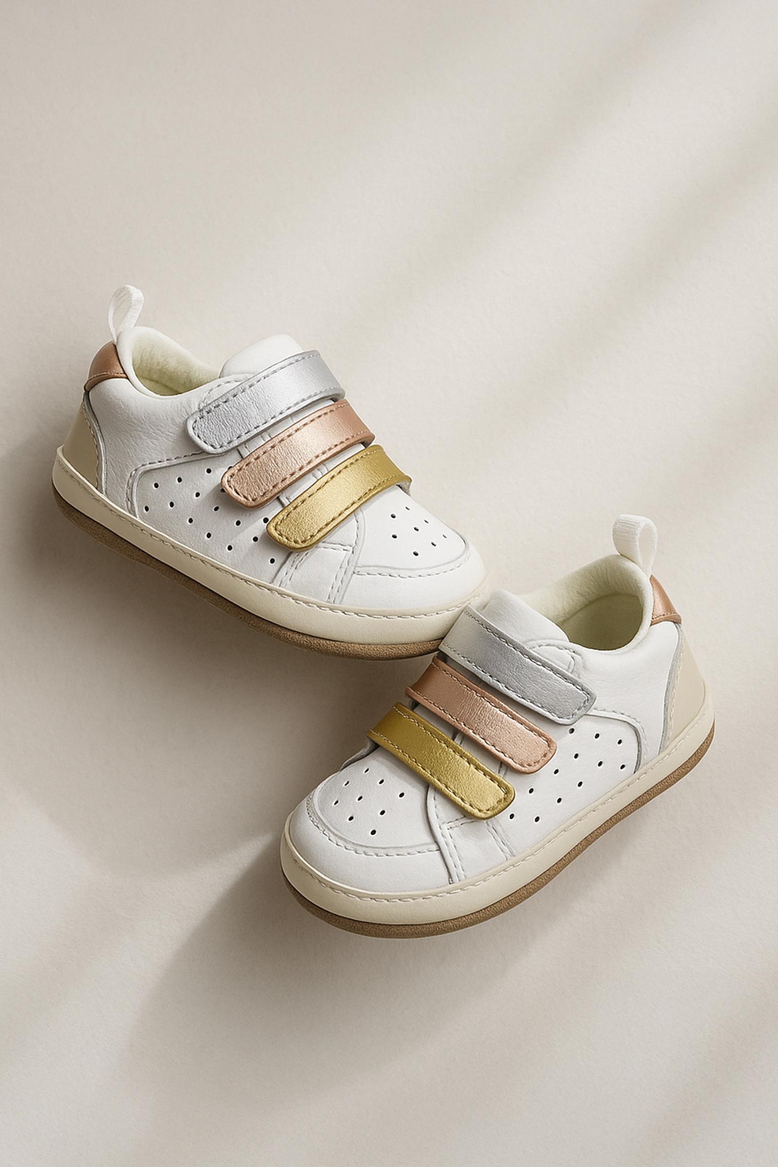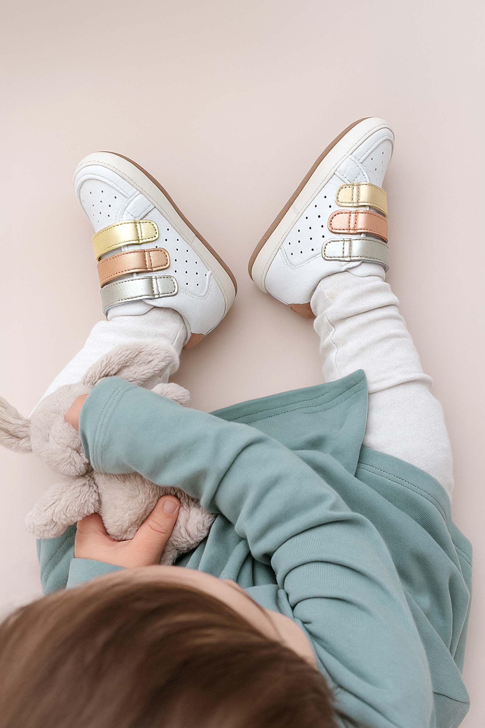 The Novie First Kicks in White bring playful shine to a classic silhouette. This double-strap sneaker features a crisp white upper paired with metallic straps in silver, rose gold, and gold, adding just the right amount of sparkle. Whether it's for first steps or first photos, they're a charming and practical pick for any baby's wardrobe.