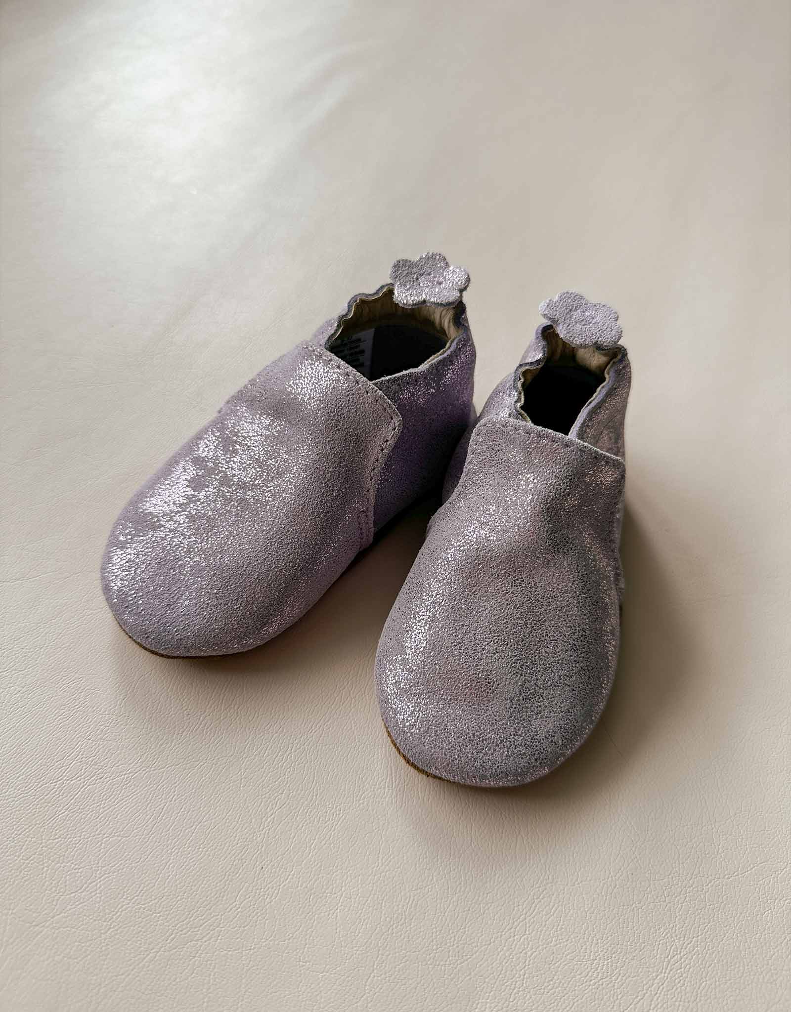The Pretty Pearl Soft Soles in Lavender are a dreamy addition to any little one's wardrobe. Featuring a beautiful pearlescent lavender finish and a sweet stand-up flower detail on the heel, these shoes combine elegance with playful charm. Designed to mimic the natural feel of bare feet, the flexible Soft Soles silhouette provides the comfort and support needed for an infant's developing steps. The easy slip-on design ensures a snug, comfortable fit for babies while offering busy parents ultimate convenience. Perfect for first walkers, the Pretty Pearl Soft Soles let little feet bloom with every step.