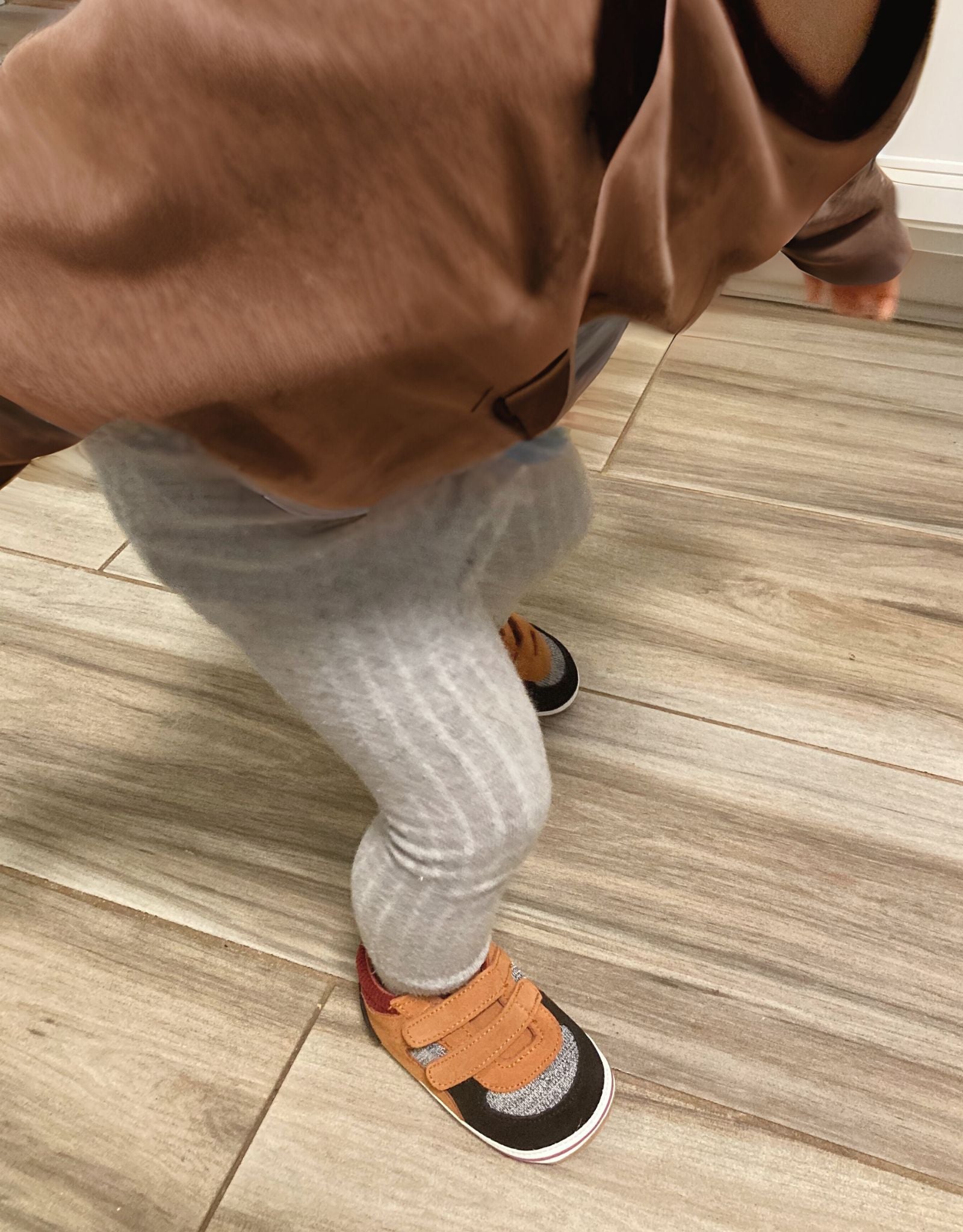 The Raiden First Kicks in Camel are a stylish and functional choice for early walkers. Featuring a soft suede upper, double strap closure, corduroy ankle detail, and marled knit accents, this high-top design offers cozy texture and easy wear. With a flexible leather sole and secure fit, these kicks support natural movement and growing feet.