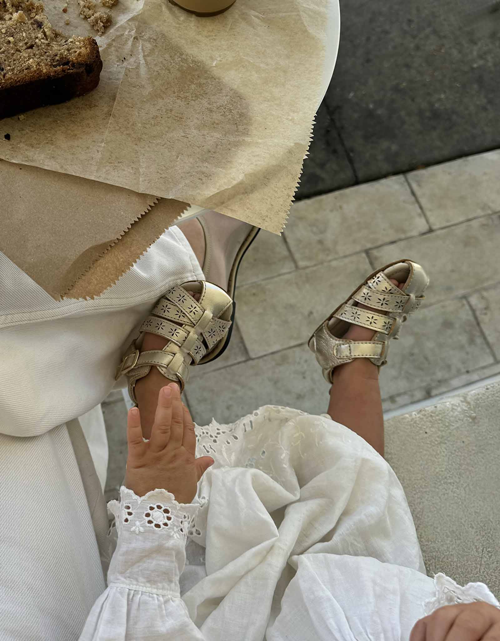 Your baby's first steps deserve the very best. The Fleur First Kicks are crafted from a soft, supple gold leather. These sandals provide a gentle, comfortable fit for your ones feet.The adjustable velcro straps ensure a perfect fit, while the suede sole provides the support and flexibility needed for those precious first strides. With their timeless fisherman sandal style, these shoes will have your little one stepping out in fashion-forward flair.