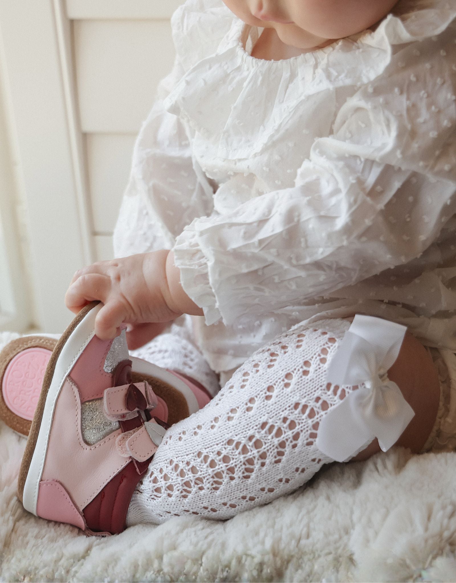 The All Heart First Kicks in Pink are full of charm and support for your little one's first steps. This classic double-strap sneaker features heart-shaped decorations on each strap, adding a sweet touch to the soft pink leather design. With a flexible sole and secure fit, these shoes are made to move, just like your growing baby.