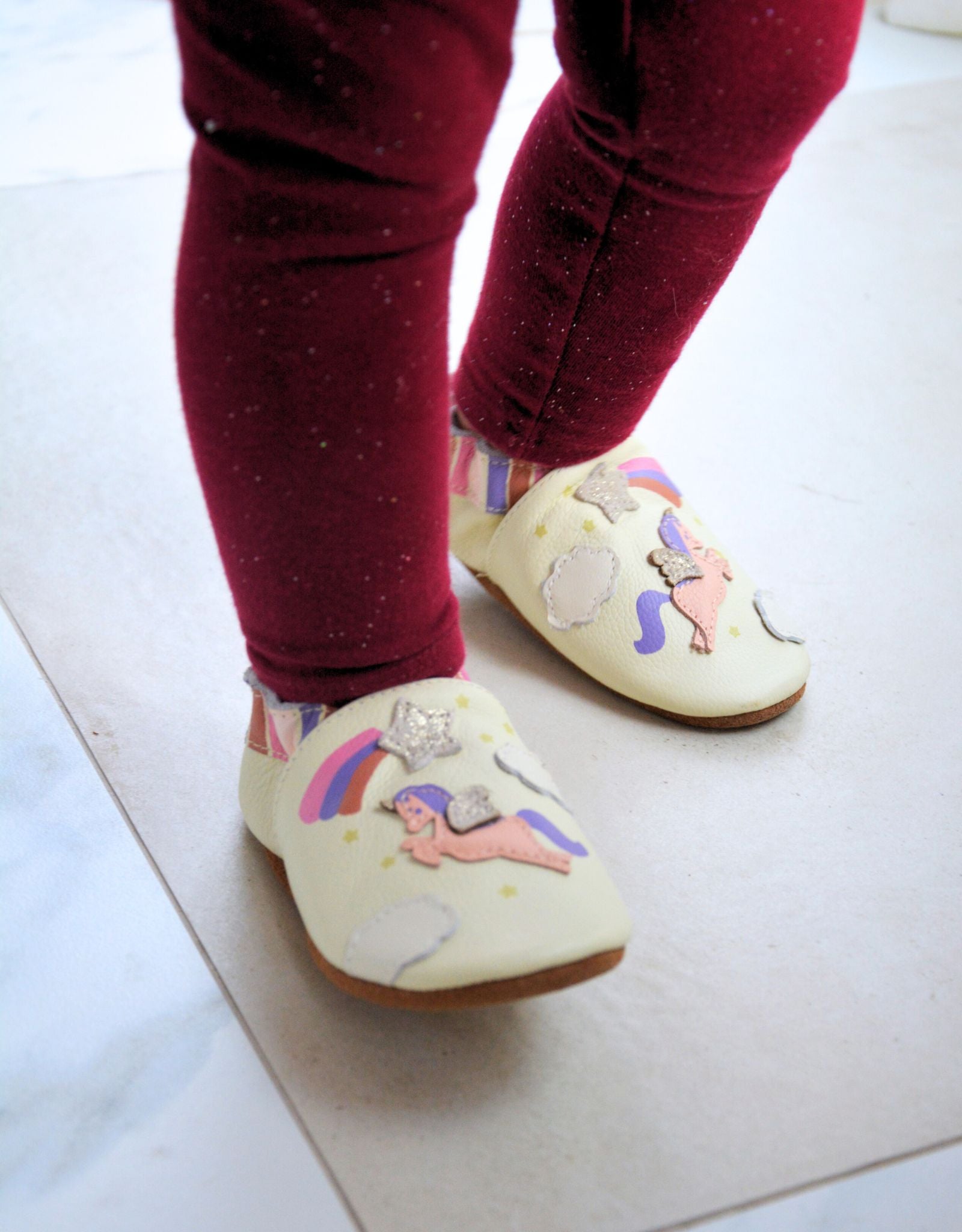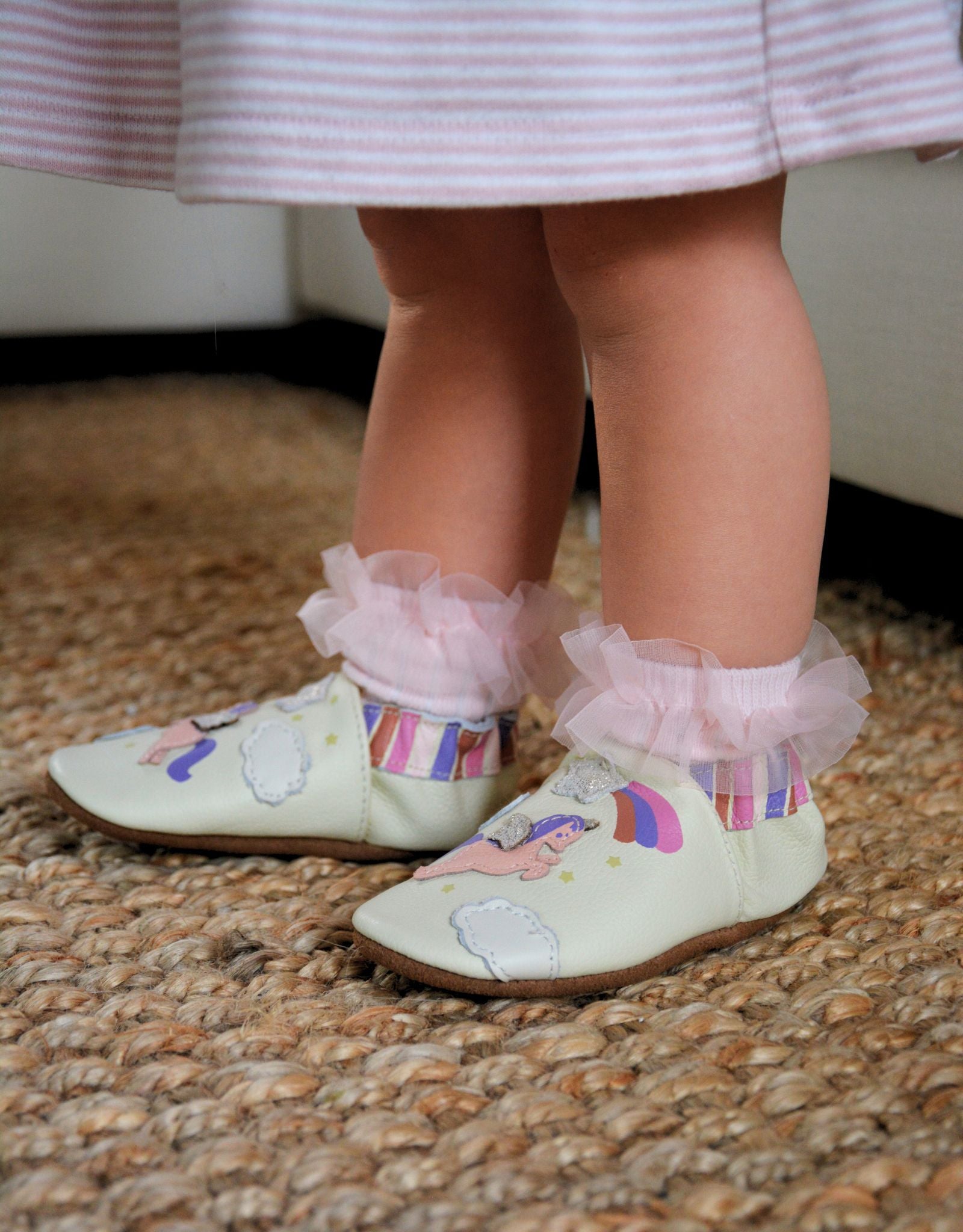 We were born to shine! Let your baby girl light up while wearing our Robeez Born to Shine soft soles in Ivory color. With unicorns, shooting stars and rainbow art she will surely stand out. The roomy fit and soft suede sole give your little one all the benefits of walking barefoot, with added traction and protection to help your baby master their first steps confidently.