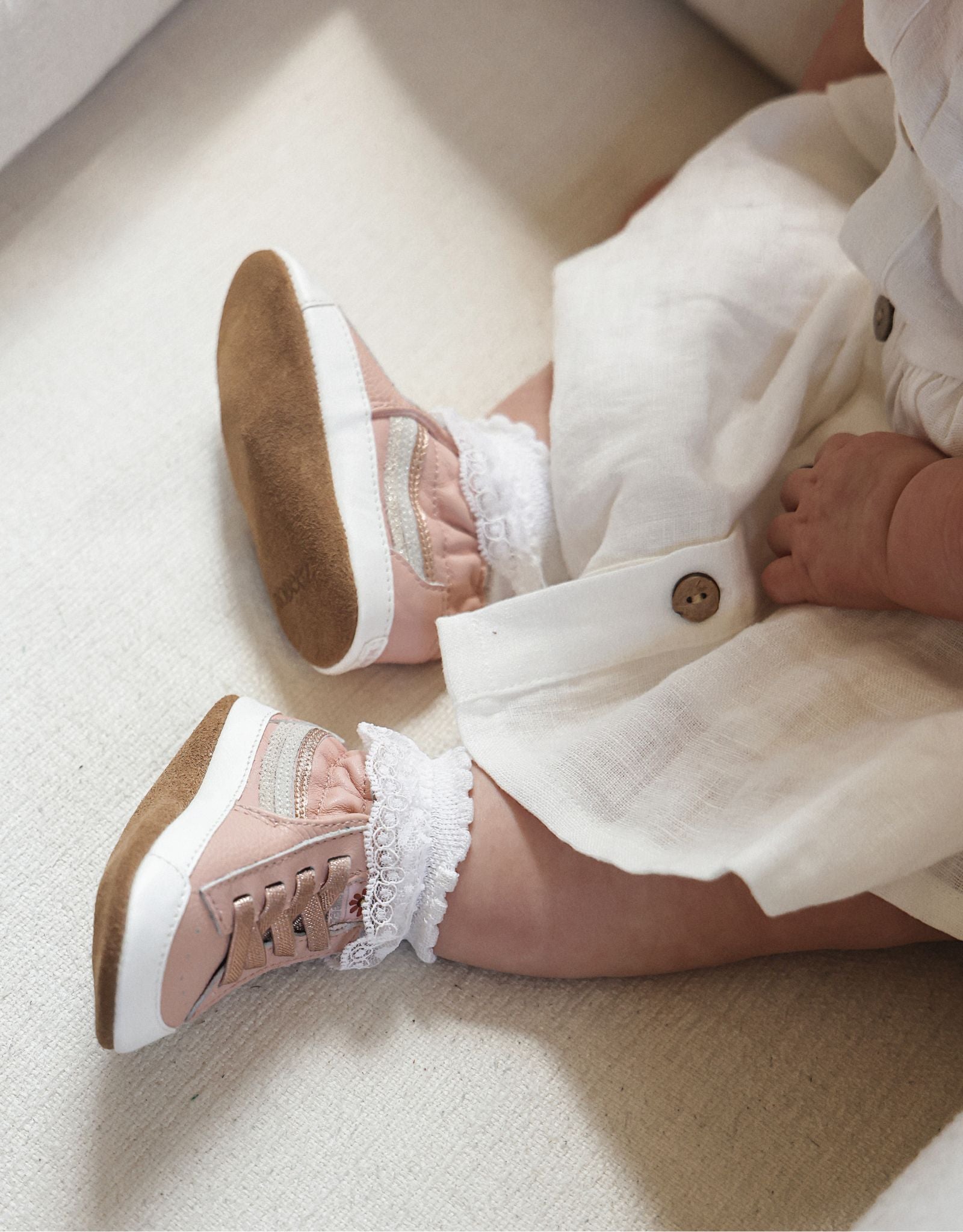 Robeez Gina Soft Soles in Blush are comfortable baby slip-ons made with a premium leather upper and a neutral brown suede on the sole. Shiny metallic leather pattern detail accross the back matching metallic stretch laces are sure to make your cutie stand out. A roomy fit and flexible material allow your baby's feet to flex naturally and grow up strong. These soft bottom baby girl shoes are carefully designed with the best materials and craftsmanship for your baby's health, comfort, and safety.