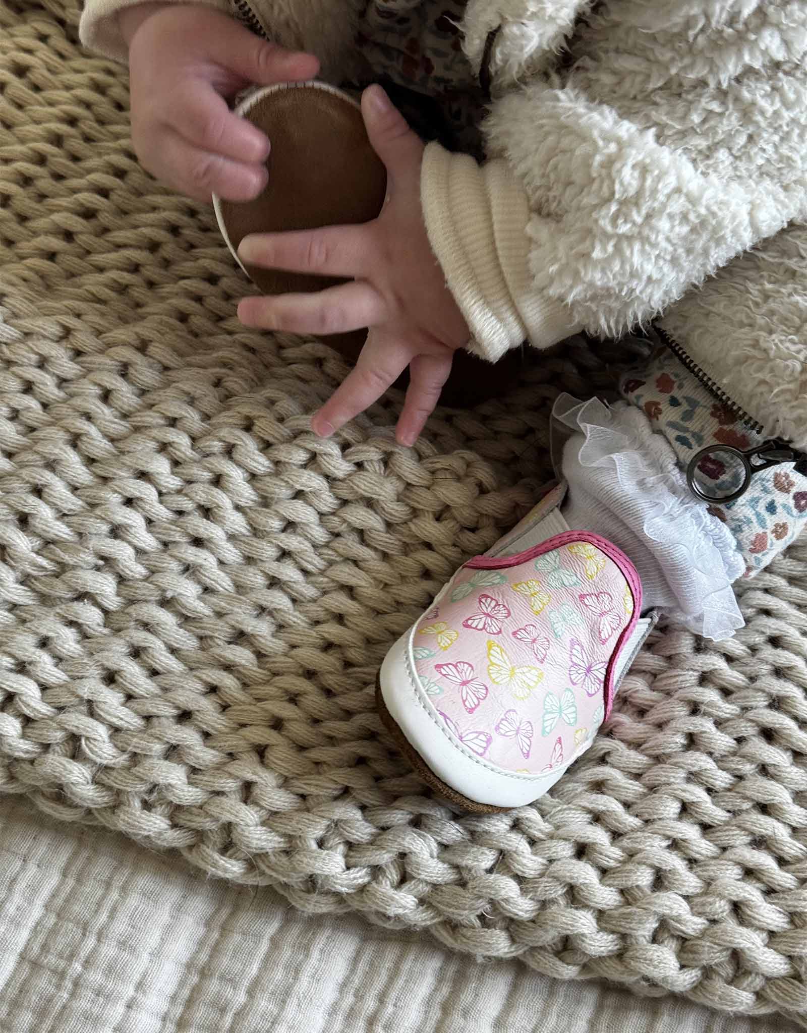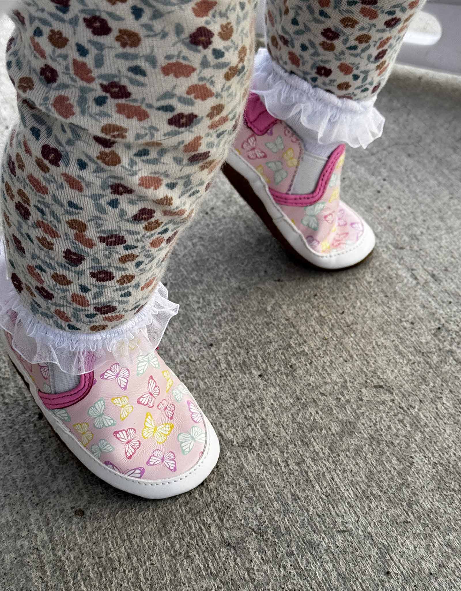 Elevate your little one's style with the Fly Away With Me Soft Soles! These adorable baby shoes are crafted from light pink leather and feature charming butterflies design that will have your toddler fluttering with delight. The soft, textured suede outsole offers superior traction, while the flexible, durable leather upper ensures all-day comfort for growing feet. Designed with a convenient slip-on style, these shoes make dressing quick and easy. Perfect for everyday wear, they combine comfort, functionality, and a whimsical touch to brighten any outfit.