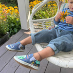 Crayola Color the World soft soles by Robeez features a blue denim upper with adorable appliques, an all-over crayon back print, side twin gore inserts and embroidered art at the bottom of the shoe. These soft baby shoes cradle the foot with a roomy, but secure fit and a cinched heel helps shoes stay on throughout the day. A textured suede sole helps little one's feet grip to the floor, so when they're off and walking they can go, go, go!