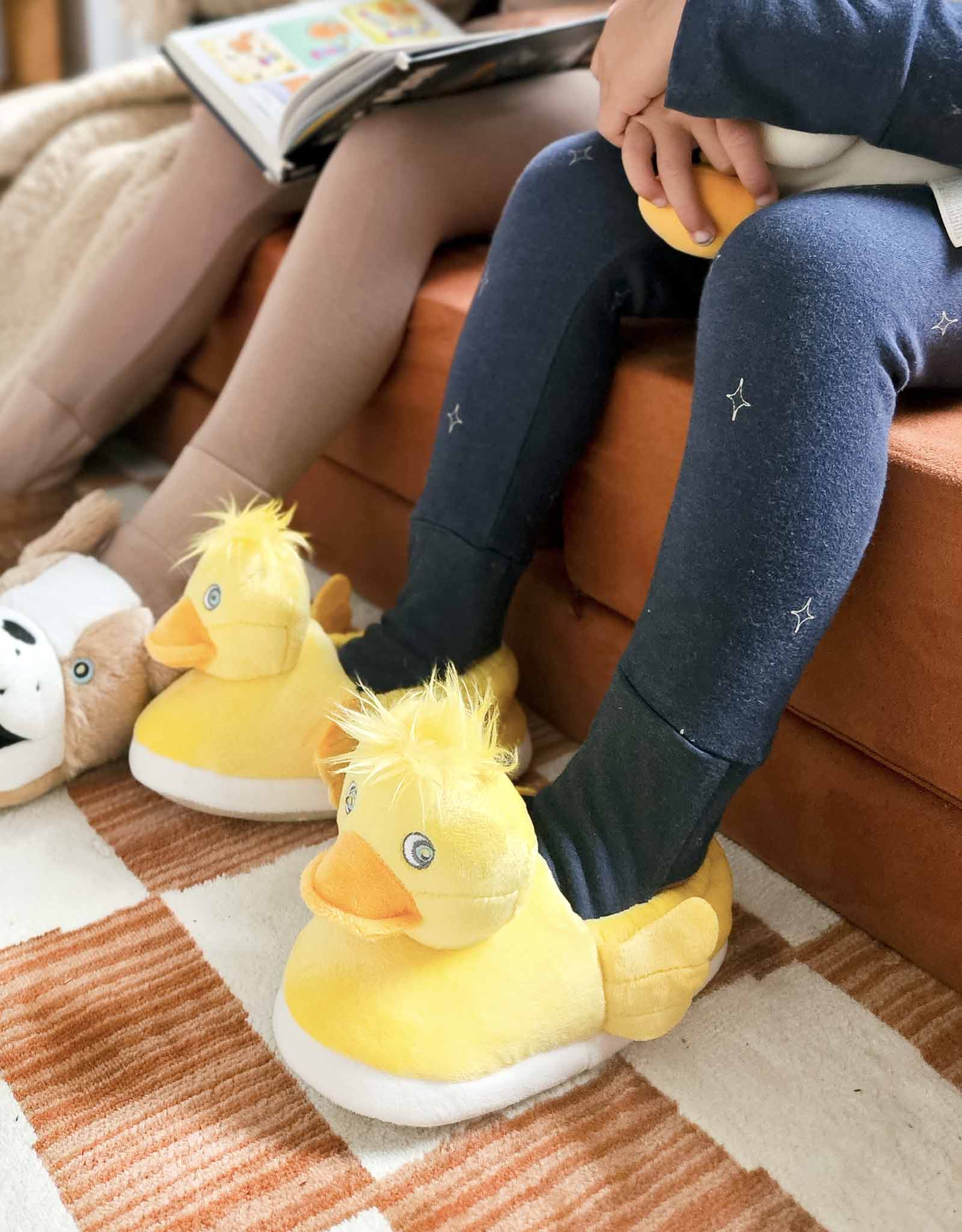 The Robeez Little Ducky Light-Up Slipper in Yellow terry duck motif with 3D beak-wings, embroidered details, plush faux fur hair and lights. Featuring a suede bottom with non-skid print & stretch back feature for stay on, play on power. *Battery included (to light up duck's eyes).