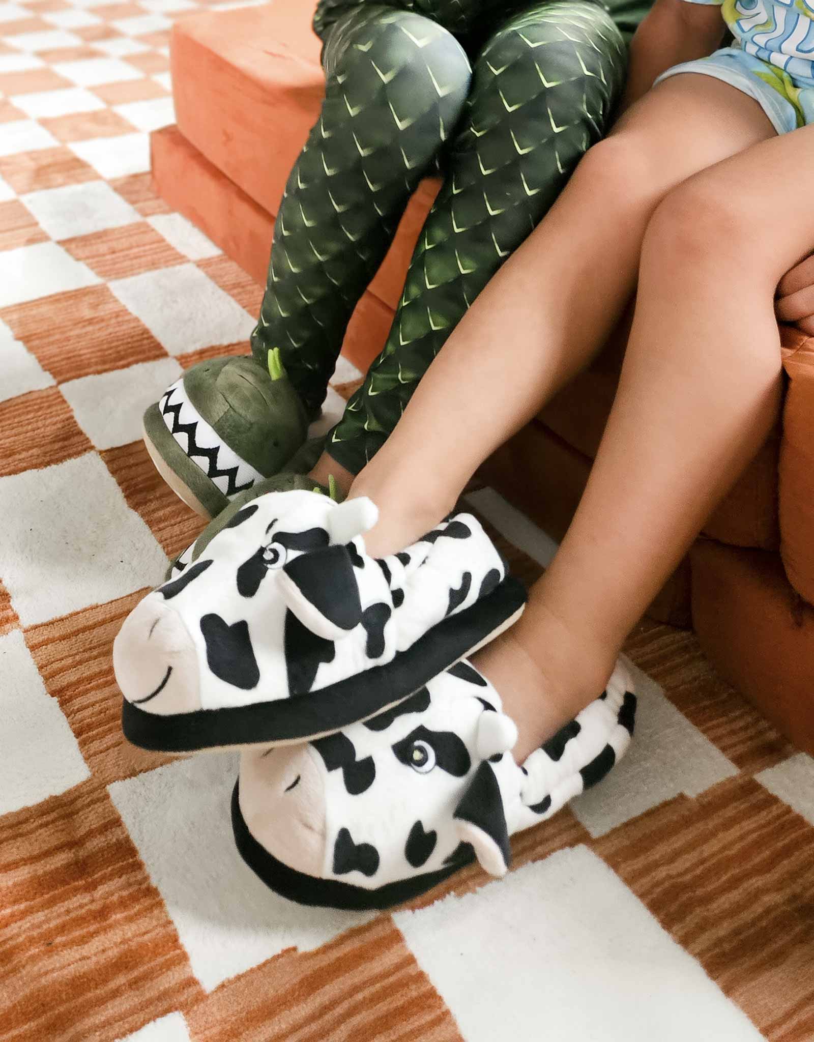 The Robeez Moo-Moo Light-Up Slipper in Ivory terry cow motif with 3D ears-horns, embroidered details and lights. Featuring a suede bottom with non-skid print & stretch back feature for stay on, play on power. *Battery included (to light up cow's eyes).