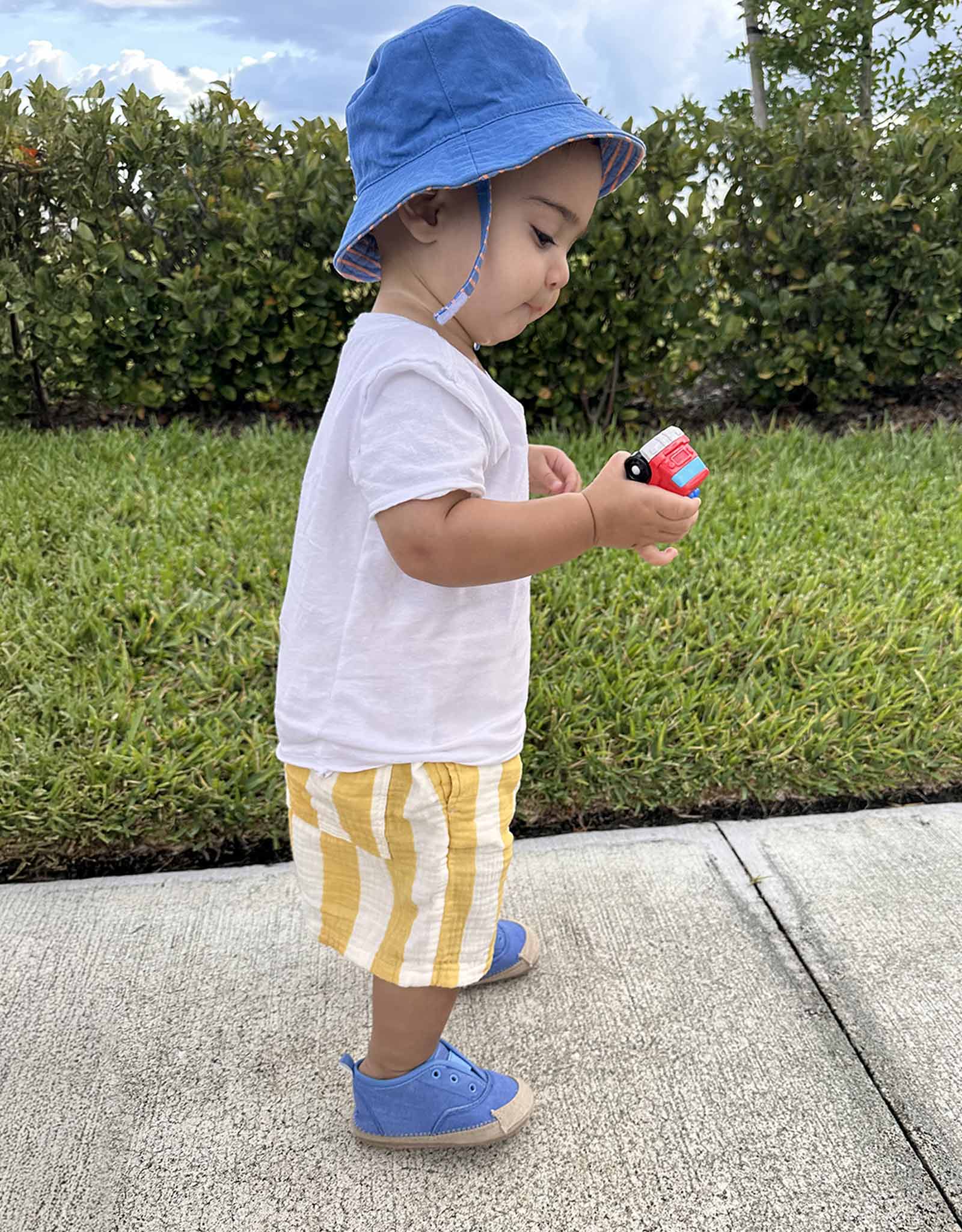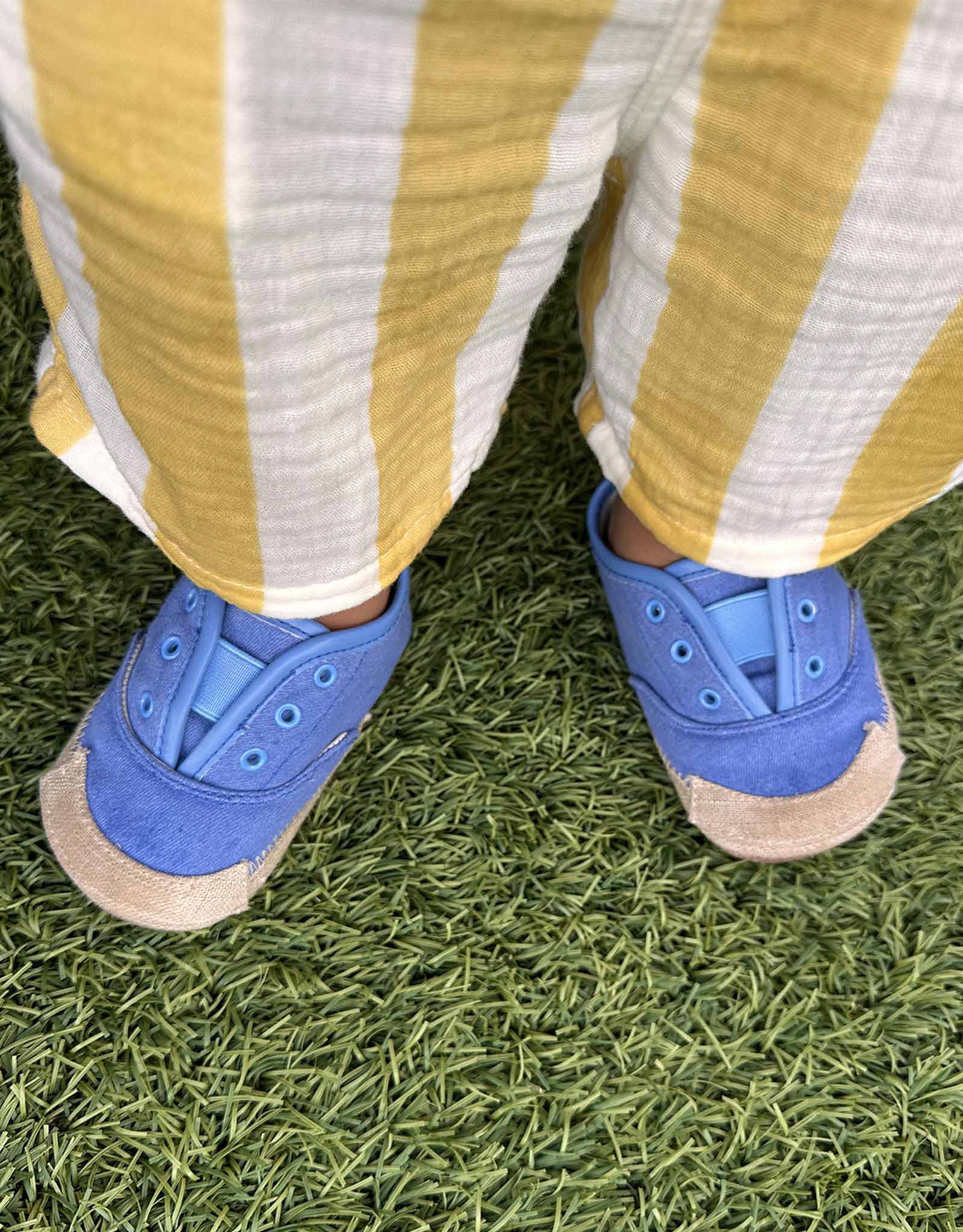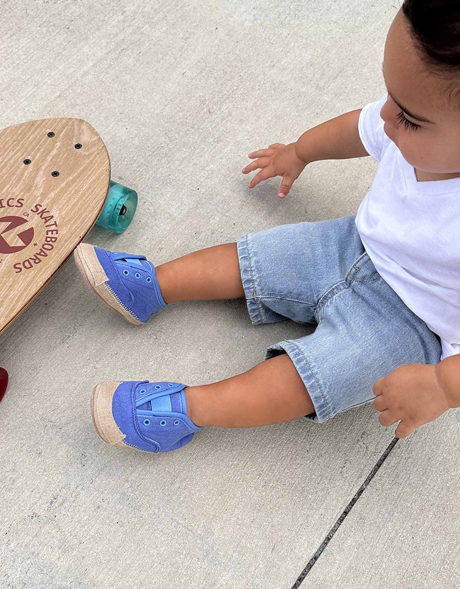 Your little one's first steps just got a whole lot cuter. Introducing the Pacific First Kicks in Blue - the perfect blend of style and support for those tiny toes. Theseespadrille-inspired feature asoft chambray upper with faux eyelets, they showcase a classic nautical look perfect for any little explorer. The flexible, non-slip rubber and suede sole provides stability and traction, while the supportive footbed encourages healthy foot development. With an easy slip-on design,these shoes ensure a versatile choice for your little ones on the move.