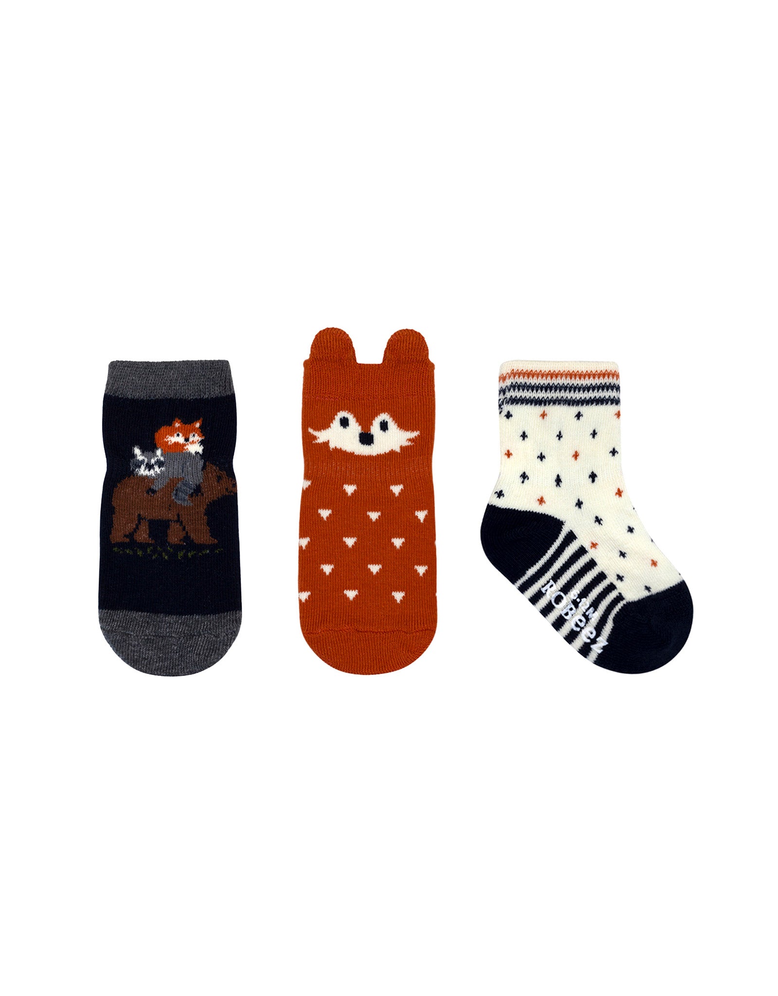Robeez Fox & Friends Flat Knit 3-pack infant-toddler crew socks in camel-navy-ivory-grey color combo. Featuring woodland animal mix, 3D critter ears and shape repeat print. The booties display Slip-resistant grips on the bottom that help keeps a baby balanced when learning to walk. The elastic gather is stretchy, but also hugs the ankle just the right amount to keep them from falling off. Plus, the breathable cotton blend is so comfortable and soft, it's perfect for baby's precious skin.
