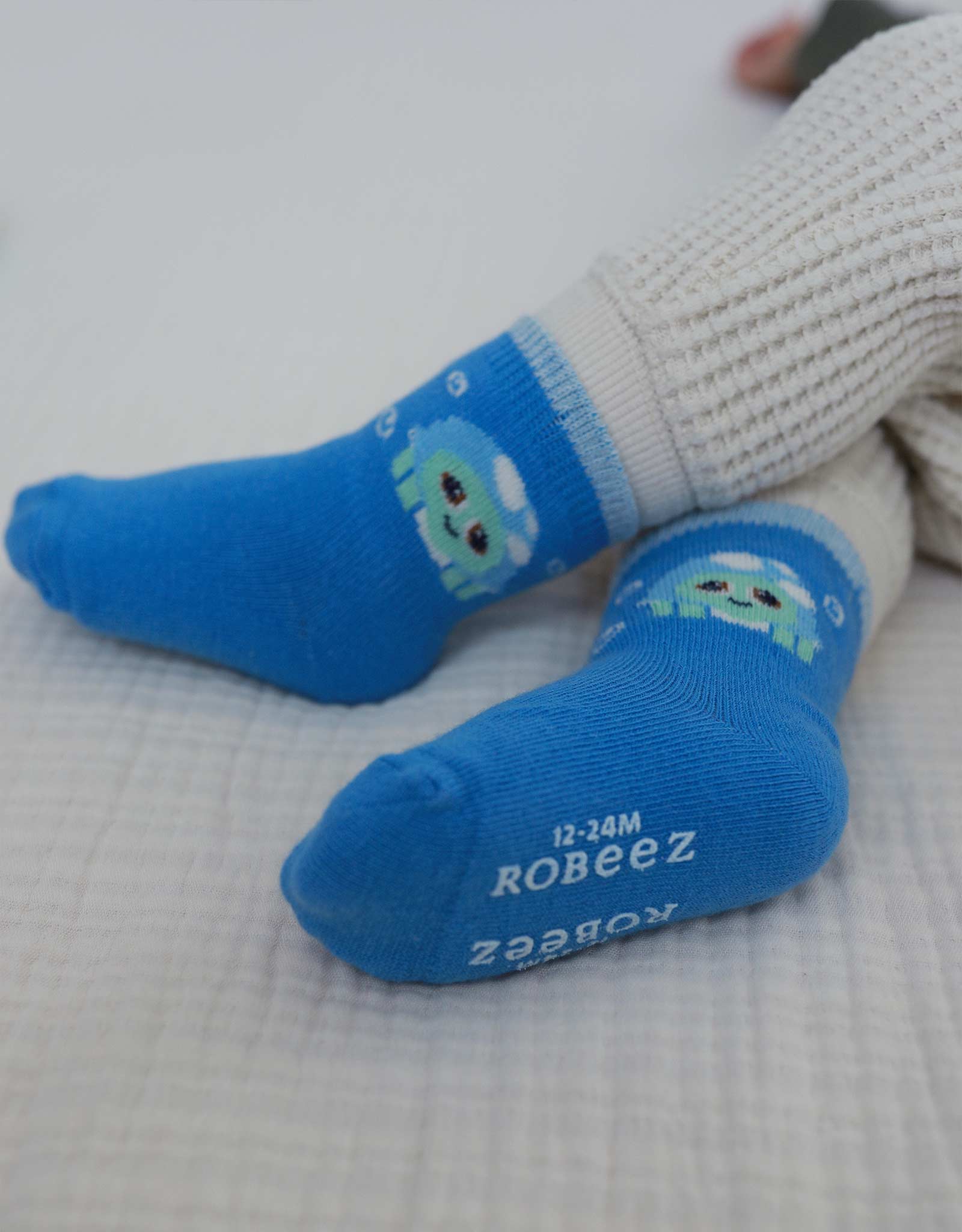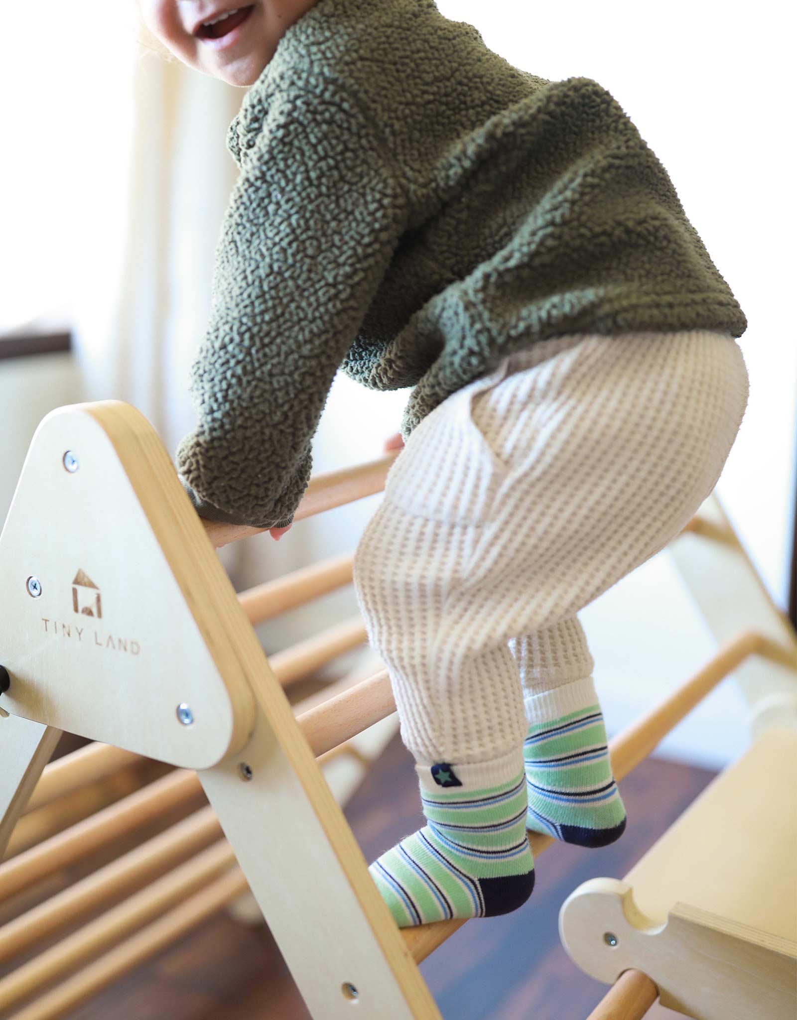 Parents love our socks because they stay on in all kinds of play. An elastic gather at the ankle ensures that our socks stay on while a skid resistant application on the soles helps prevent slips and falls. Once you try our socks, you and your baby will love them as well