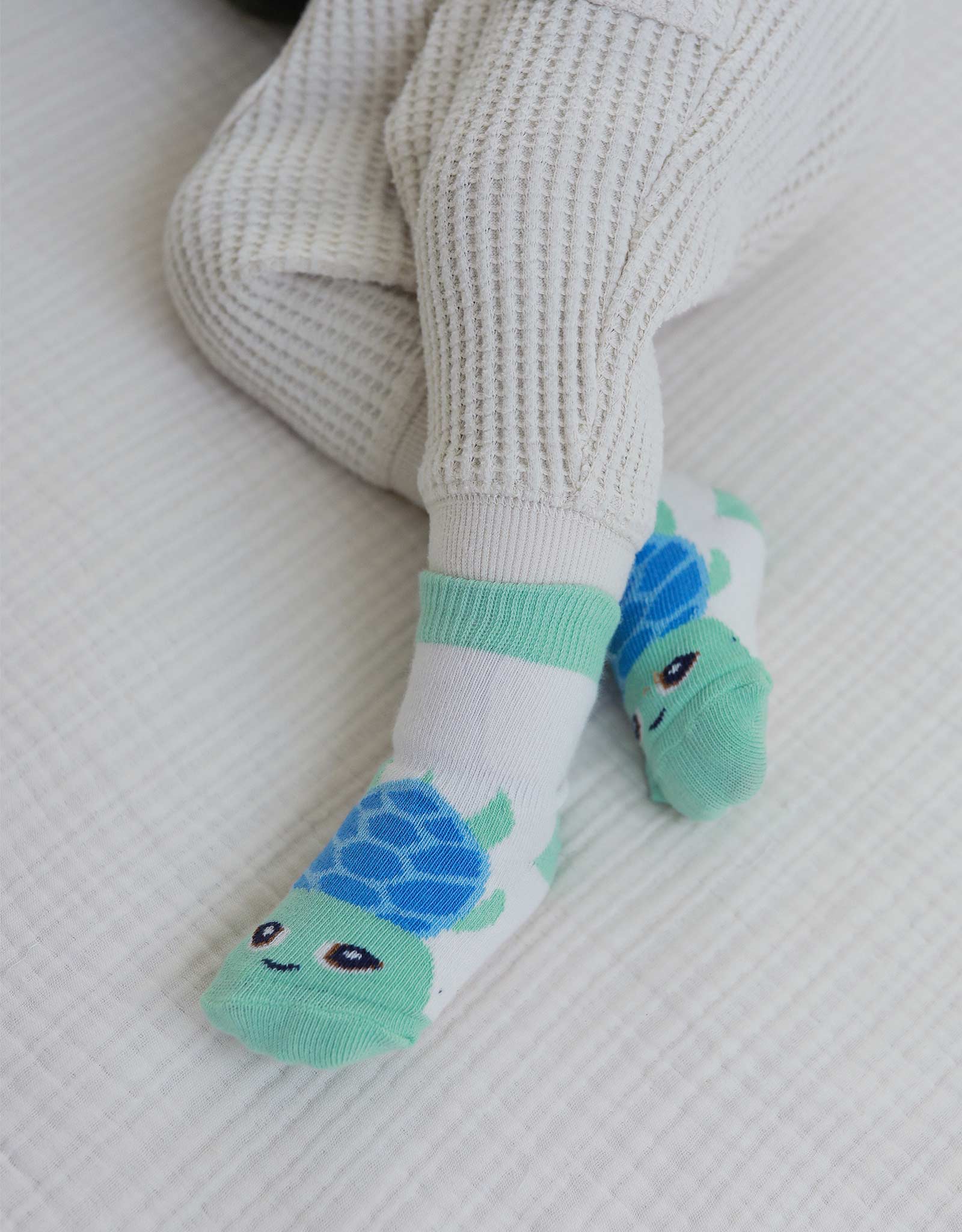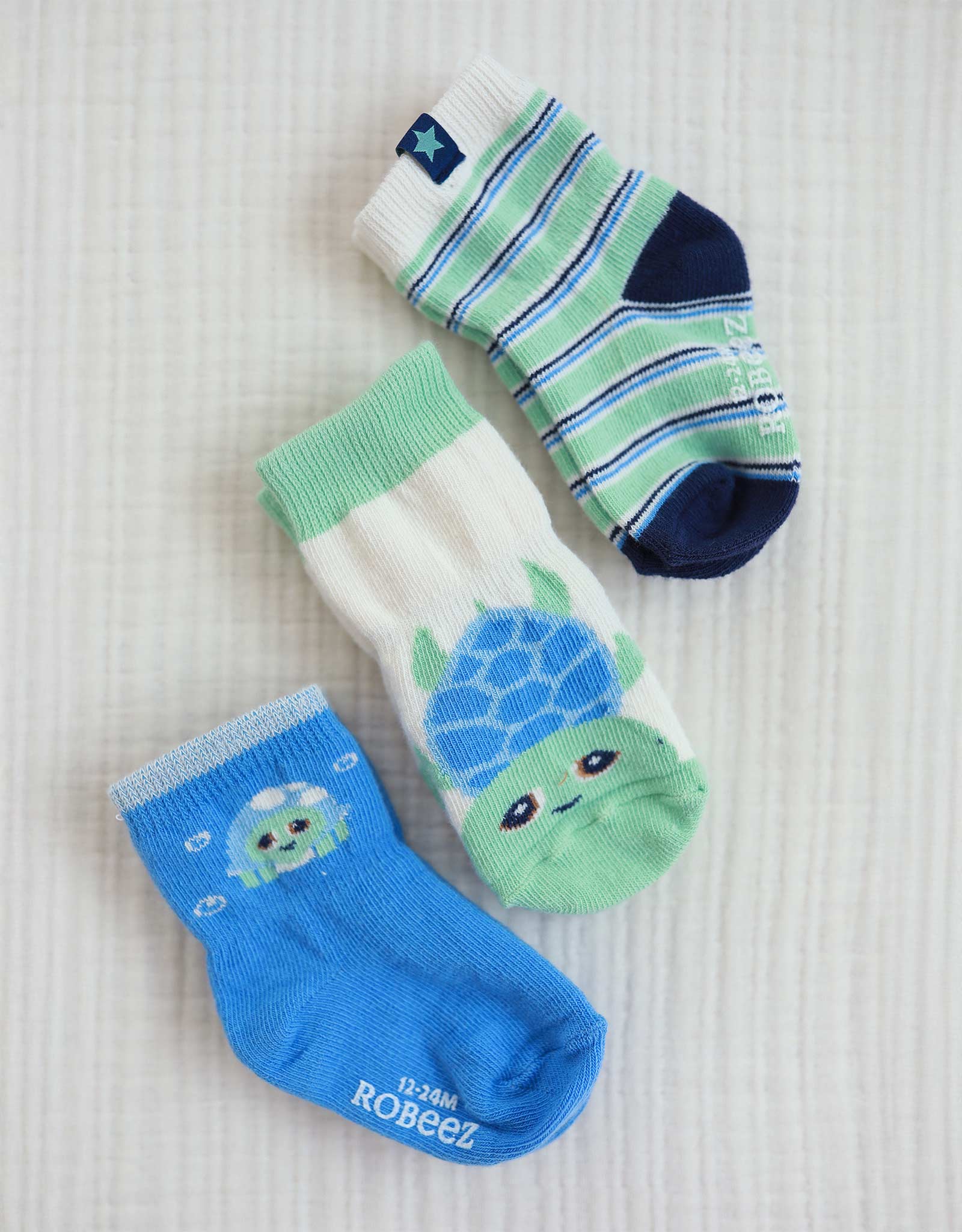 Add some turtle-inspired fun to your baby's day with the Turtle-Y Cute 3-Pack Baby Socks. This set includes three pairs, each adorned with a unique turtle design. Crafted from a soft, stretchy cotton blend, these socks provide a comfortable and secure fit, perfect for keeping tiny feet warm and stylish during everyday adventures. Note: Socks are lined when they have heavier art or placement of art is on the bottom half of the sock that will have more contact with babies' toes. This is done to ensure that the babies' toes do not get caught on the inside loops of the socks. Socks should fit correctly with and without the liner.